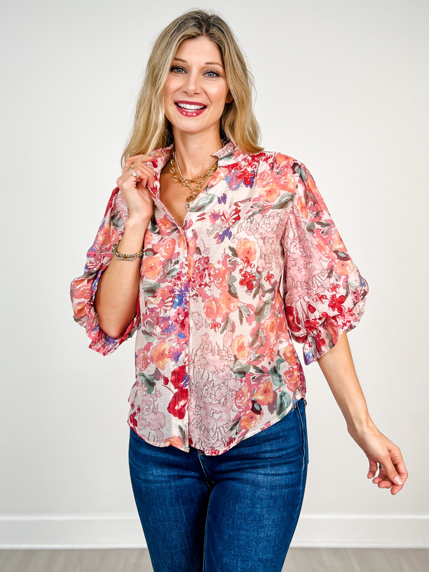 Bloom into your week with this charming 3/4-length-sleeve button-down top! Featuring a vibrant floral print that brings garden-fresh style to any outfit, this versatile piece transitions effortlessly from casual coffee dates to weekend adventures. The classic button-down silhouette offers timeless appeal, while the three-quarter sleeves strike the perfect balance between coverage and breathability. Layer it over a tee, tie it at the waist, or wear it solo—this floral favorite is ready for whatever your day brings!