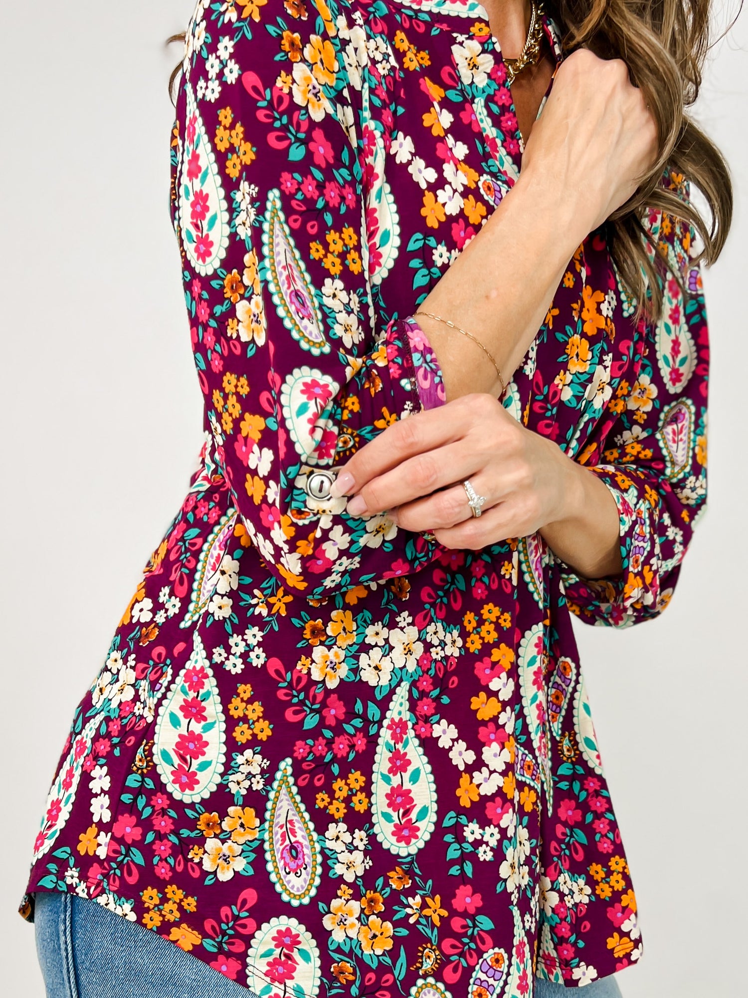 [message]Brighten your wardrobe with the Floral Print Lizzy Top, featuring a charming mandarin collar and breezy 3/4 sleeves. Its playful floral pattern adds a fresh, fun vibe perfect for any casual outing or sunny day. Comfortable and stylish, this top effortlessly blends feminine details with easygoing flair.