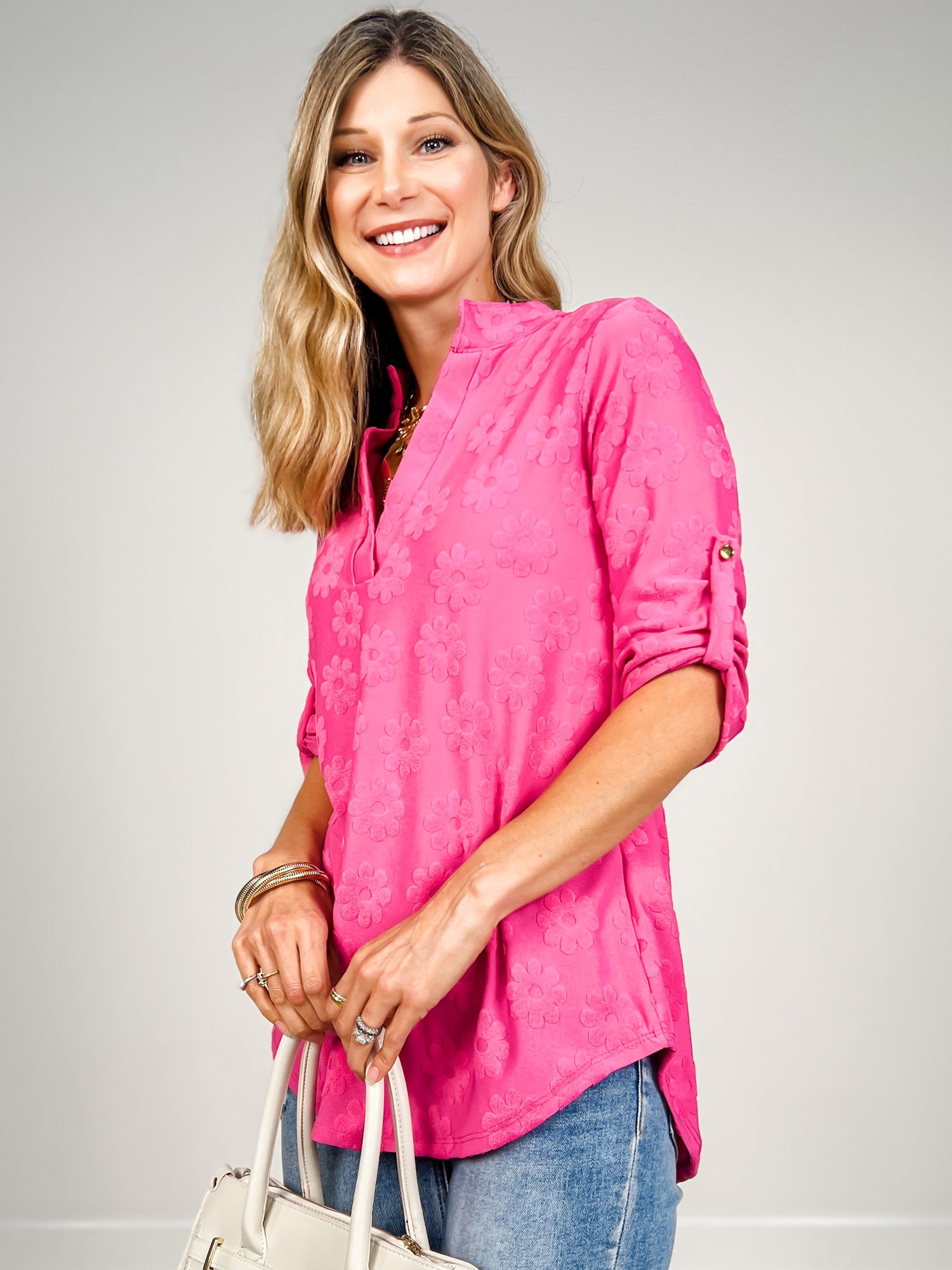 Elevate your everyday style with this charming 3/4-sleeve top featuring a delicate floral texture and a modern split neckline. The three-quarter length sleeves offer the perfect balance between coverage and breathability, while the textured fabric adds visual interest and dimension. The split neck design creates a flattering, contemporary silhouette that works beautifully for casual outings or dressed-up occasions. Pair it with your favorite jeans, skirts, or trousers for versatile styling options that transition seamlessly from day to night.