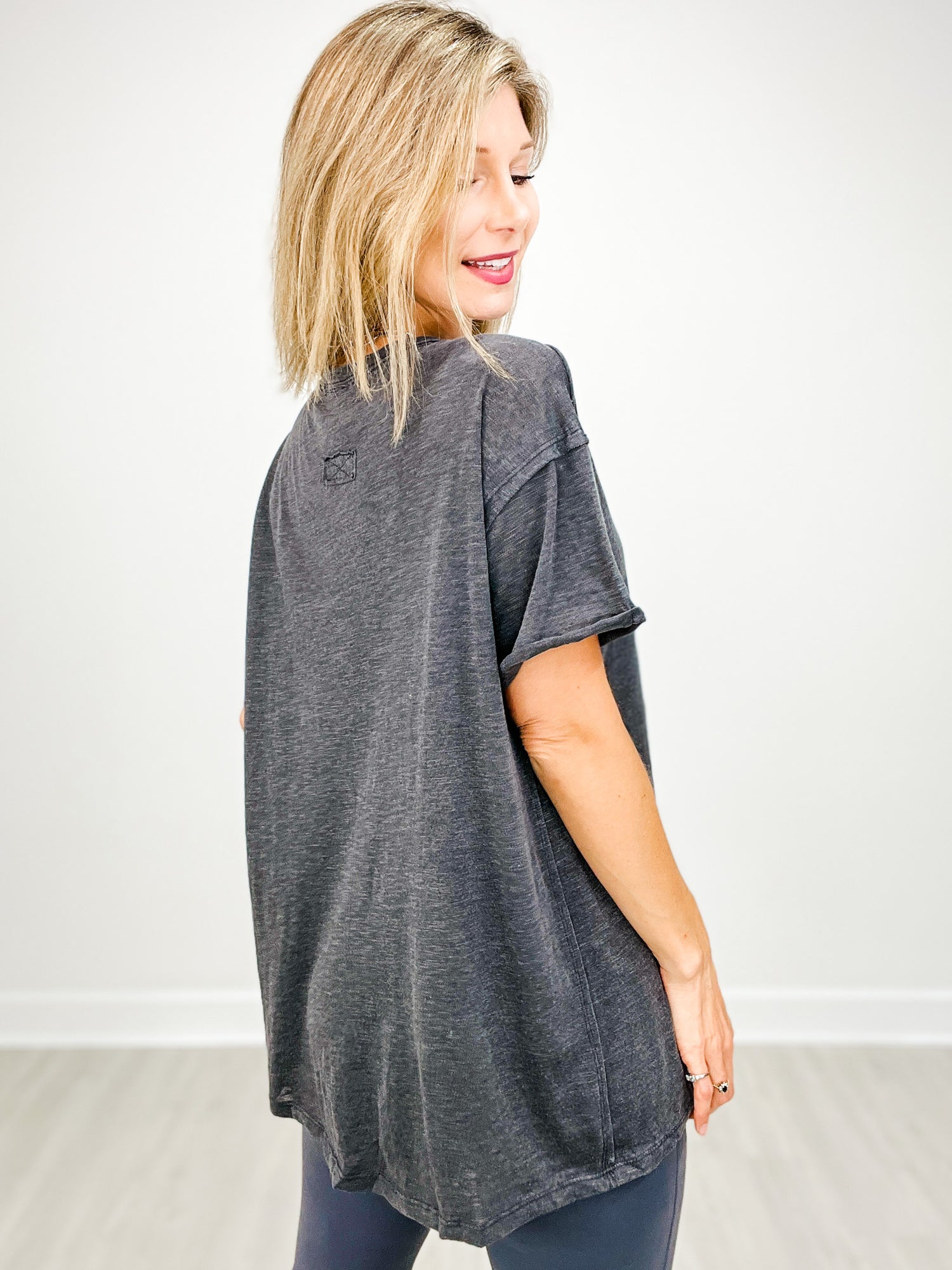 CVC Slub, Mineral Washed Round Neckline Short Sleeves with Pocket Top This style has been mineral washed. Any irregularities in color are not defects.