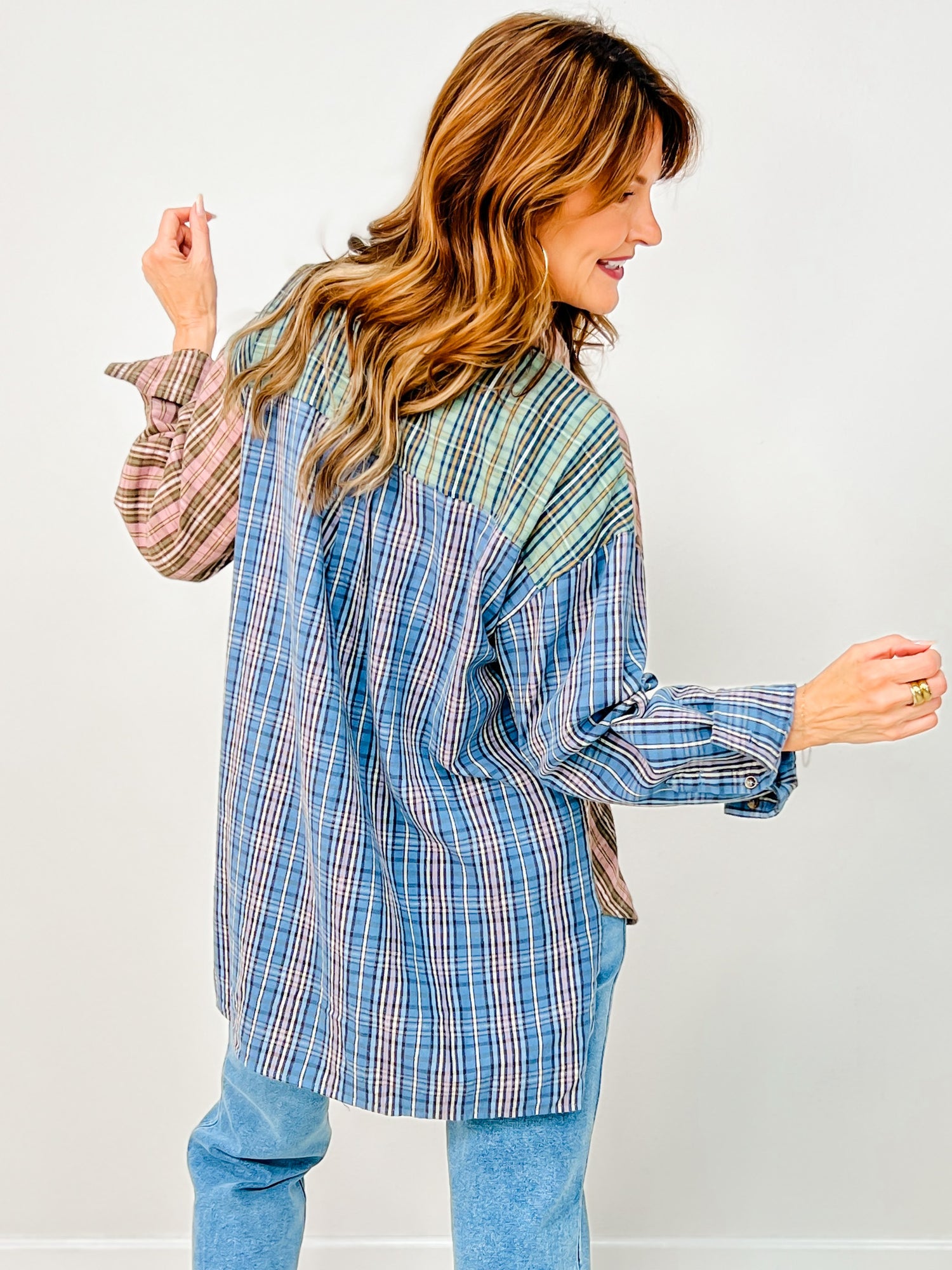 This Artisanal Patchwork Plaid Button-Up Top brings a curated, vintage-inspired aesthetic to everyday style. Crafted from premium lightweight cotton, it features a harmonious mix of multicolor plaids in a bespoke panel design, creating visual interest and individuality. The relaxed silhouette, chest pocket, and full button closure offer both comfort and versatility, making it a refined statement piece for layering or wearing solo.