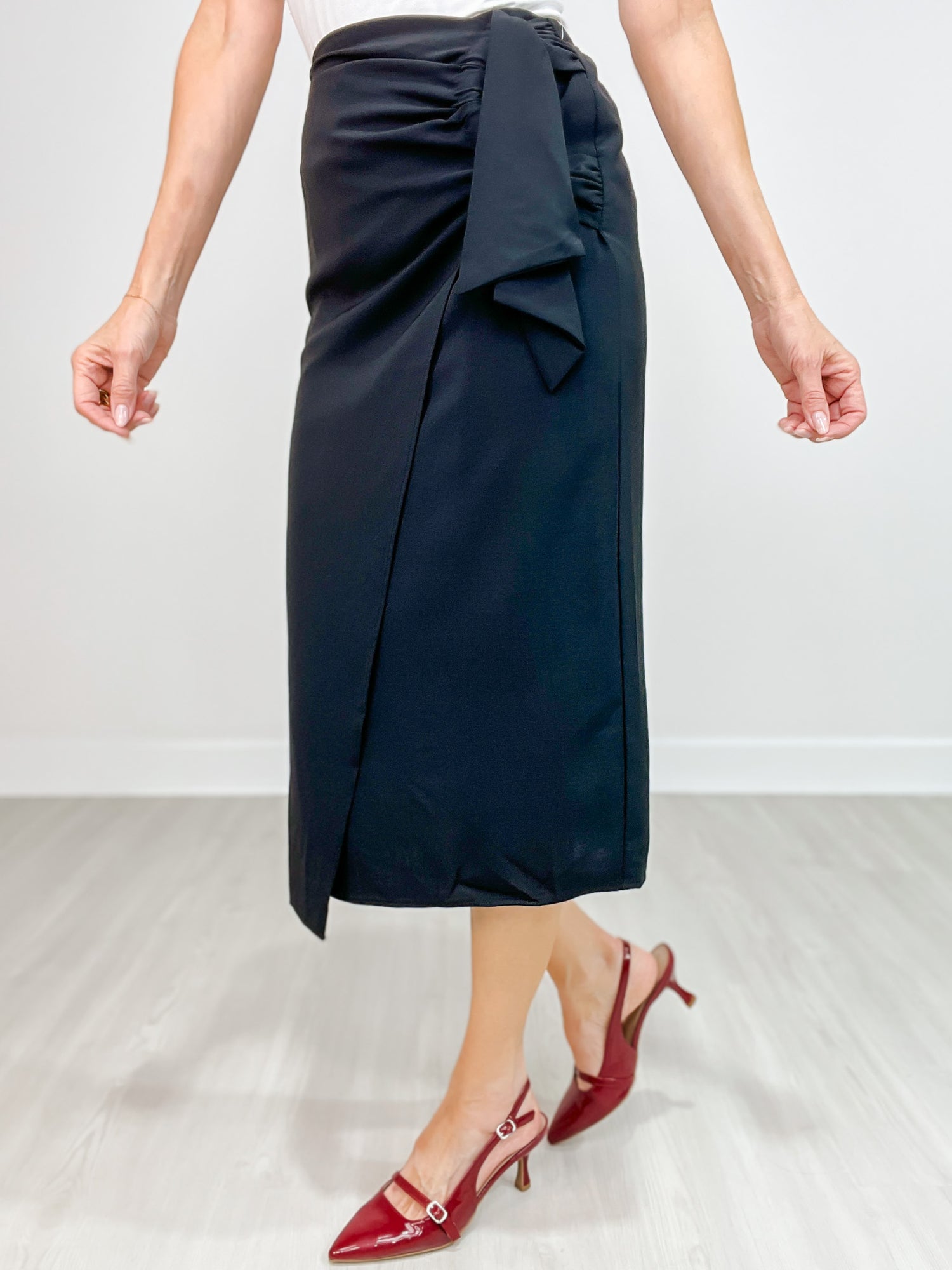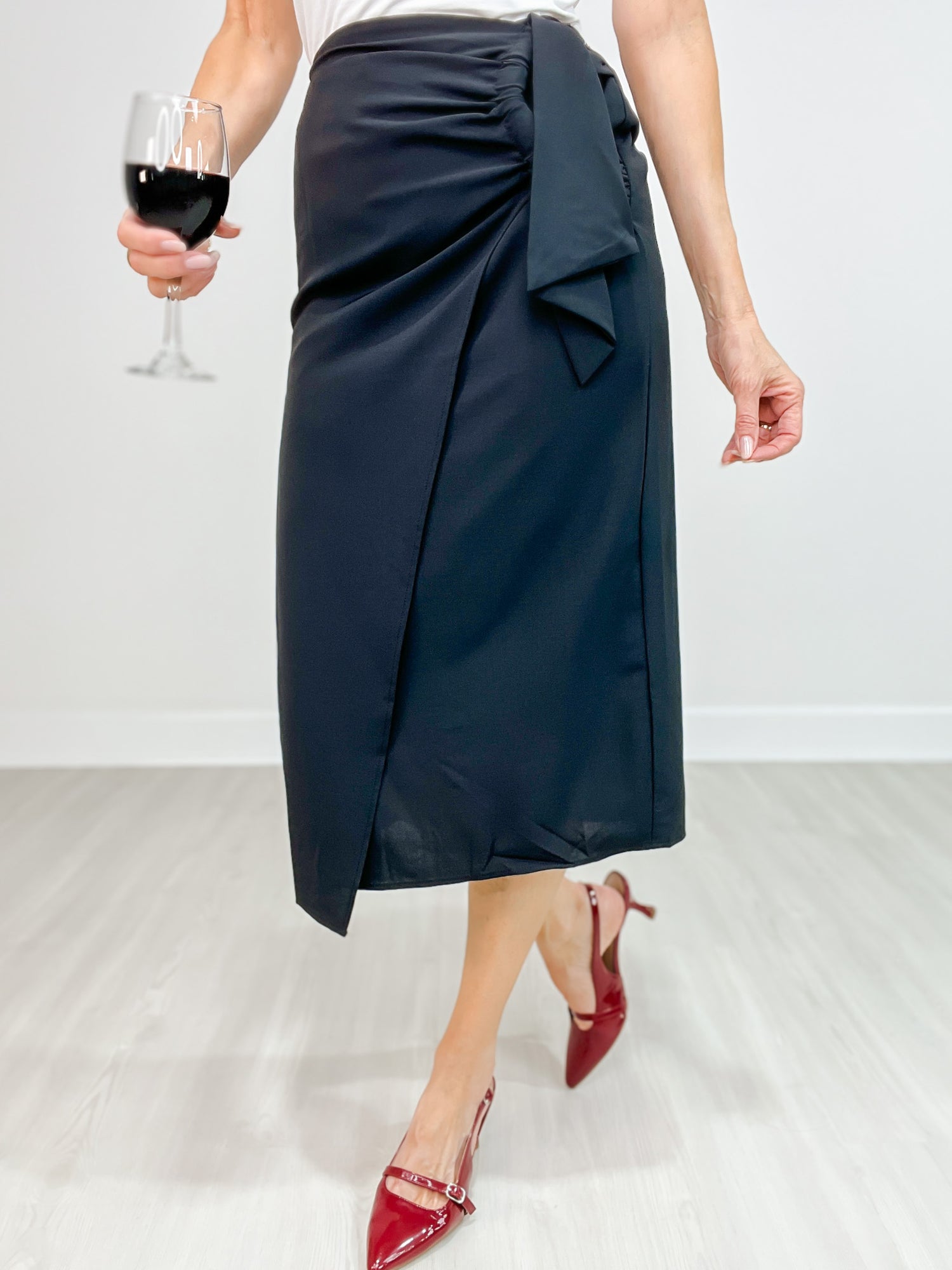A high-waisted solid woven skirt with an asymmetric ruched front featuring a wrapped body and a true-to-size fit. Fabric is a lightweight woven material.