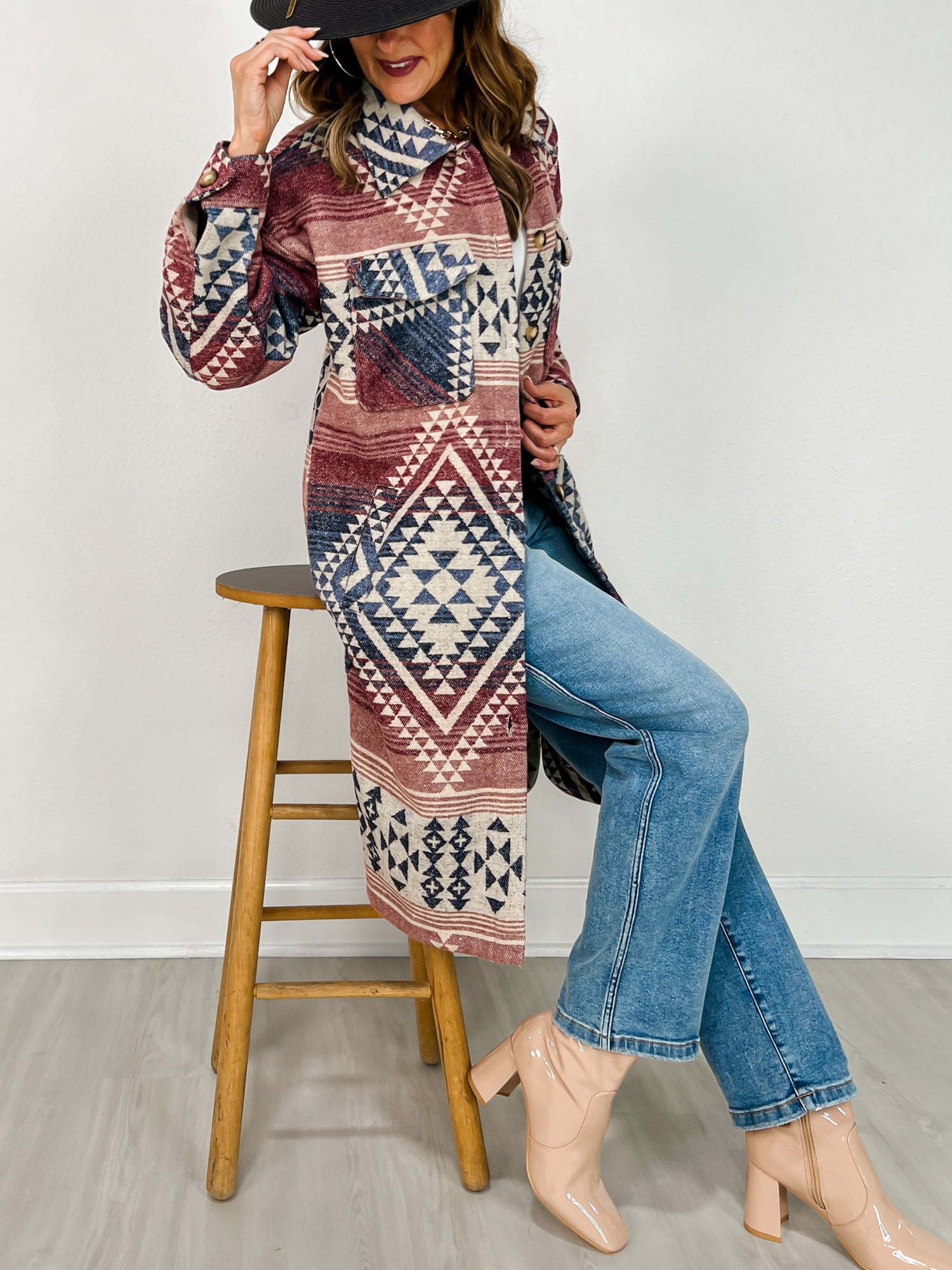 Wrap yourself in cozy charm with the Aztec Print Button Down Long Shacket Coat. Its bold, eye-catching pattern adds a fun twist to your layering game, while the classic button-down style keeps it effortlessly cool. Perfect for those days when you want to stay warm without sacrificing flair, this shacket combines comfort and style in one playful package. Whether you’re out for coffee or exploring the city, it’s your new go-to for standout seasonal outfits.