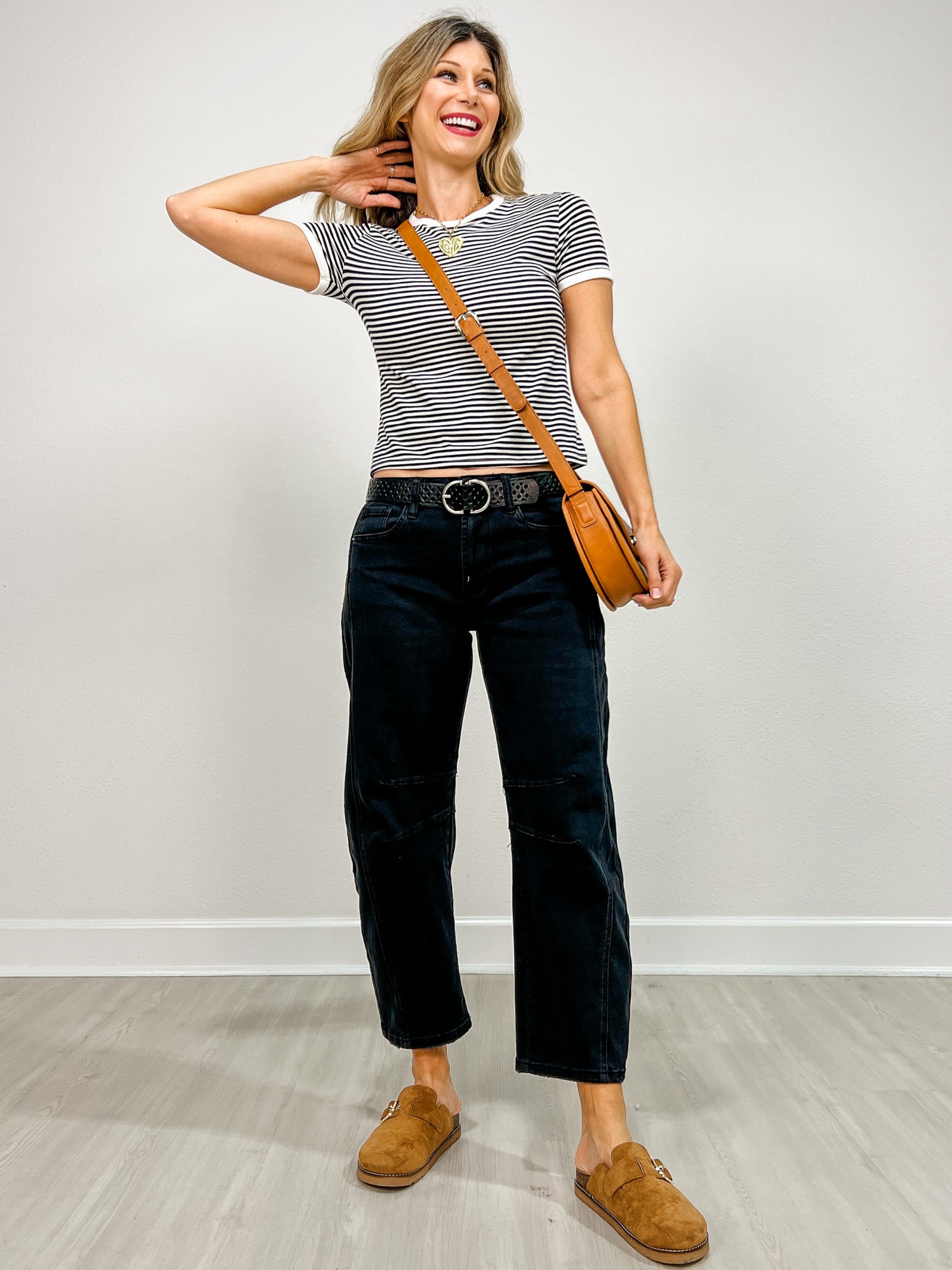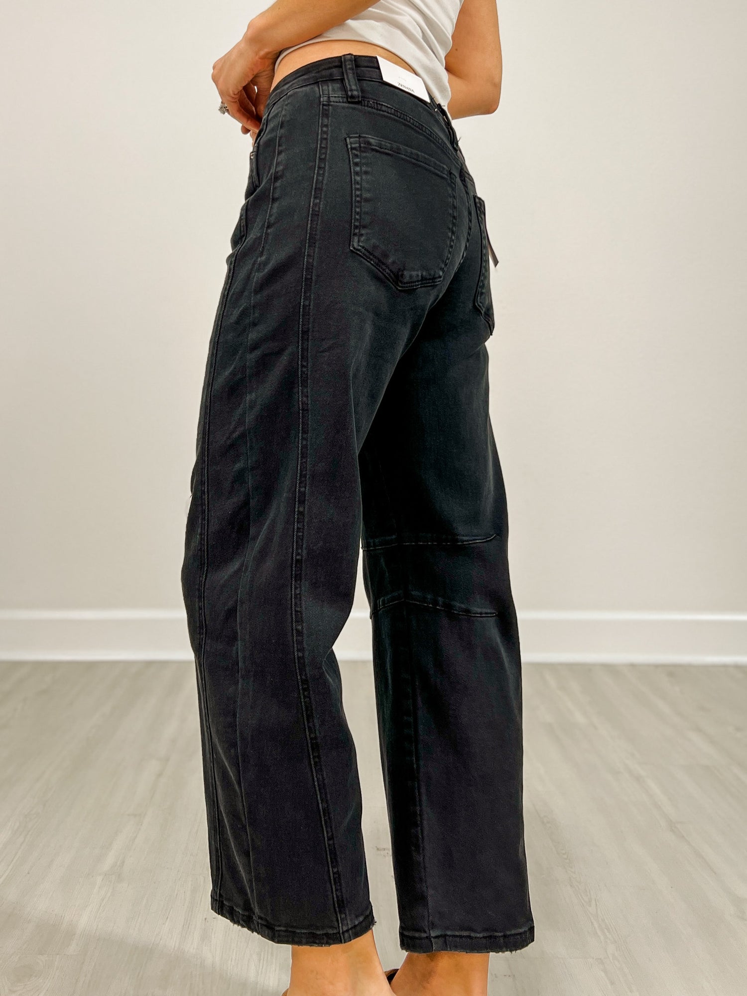 Elevate your denim game with these Black High Rise Barrel Denim Pants—the perfect blend of retro cool and modern edge. The high-rise waistband flatters your silhouette while the relaxed barrel leg creates an effortlessly chic vibe. Crafted from quality denim, these pants transition seamlessly from casual coffee runs to night-out ready. Style them with a fitted top to balance the roomy cut, or go full '90s with an oversized tee. A wardrobe essential that proves timeless style never goes out of fashion.
