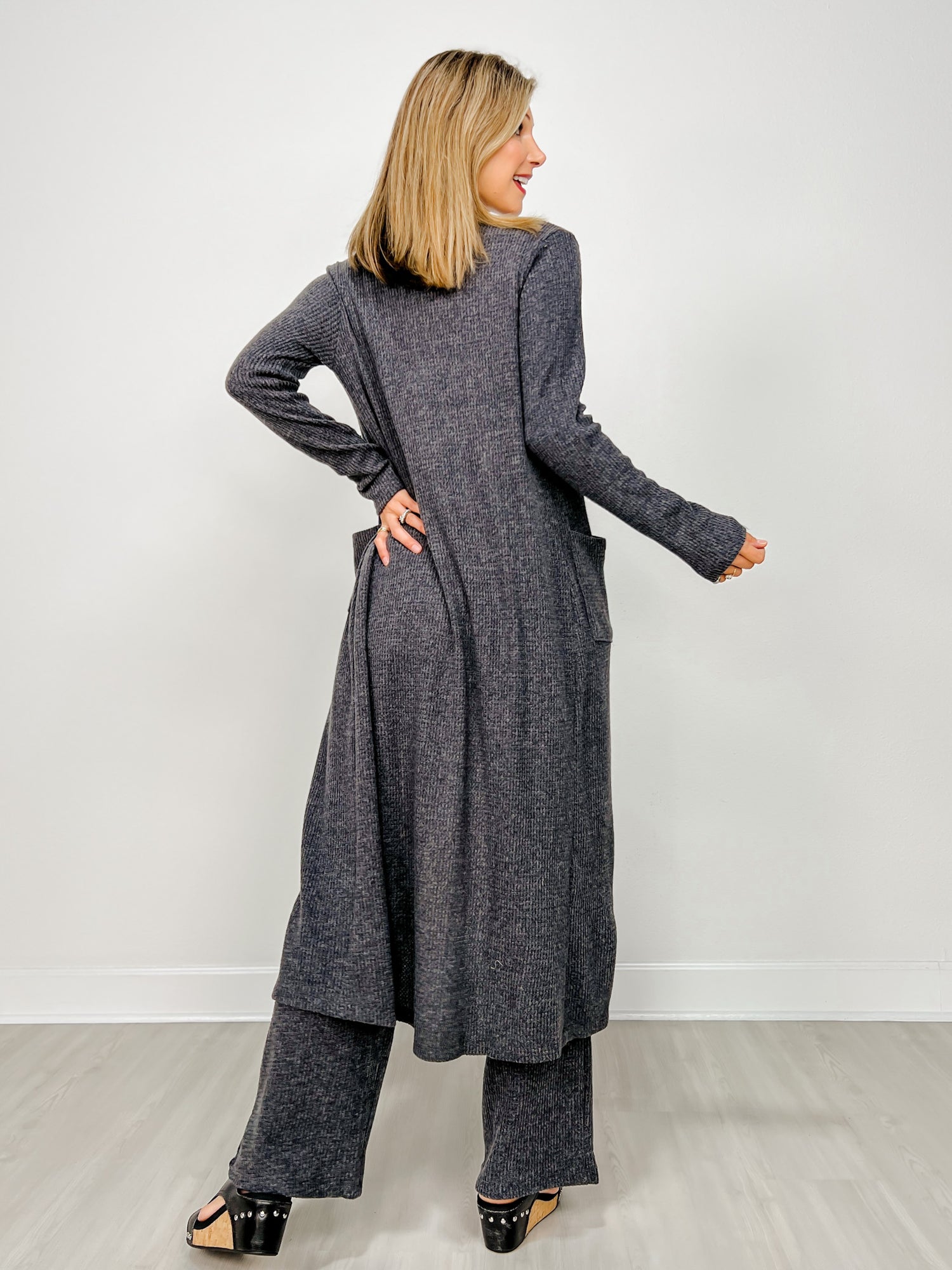 This beautiful 3-piece brushed thermal set is all you need this season! Featuring a soft sleeveless tank, a long open-front cardigan with pockets, and relaxed-fit pants, this coordinated look delivers both comfort and sophistication. The cozy brushed thermal fabric adds warmth without bulk, making it perfect for lounging, travel, or effortless everyday wear. Mix and match the pieces for endless styling options and elevate your off-duty wardrobe with this chic, laid-back ensemble.