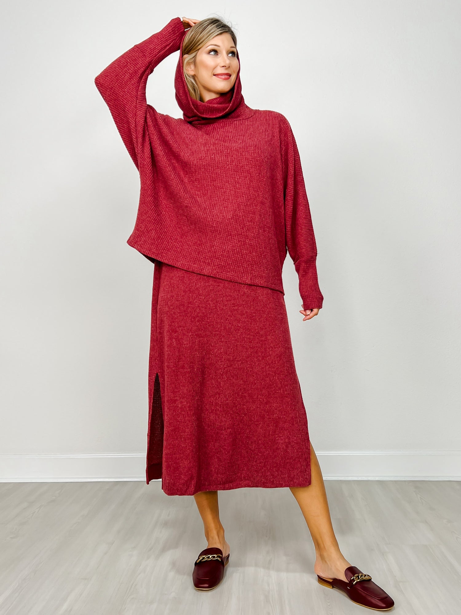 Brushed Thermal Cowl Neck 2-Piece Set in Wine