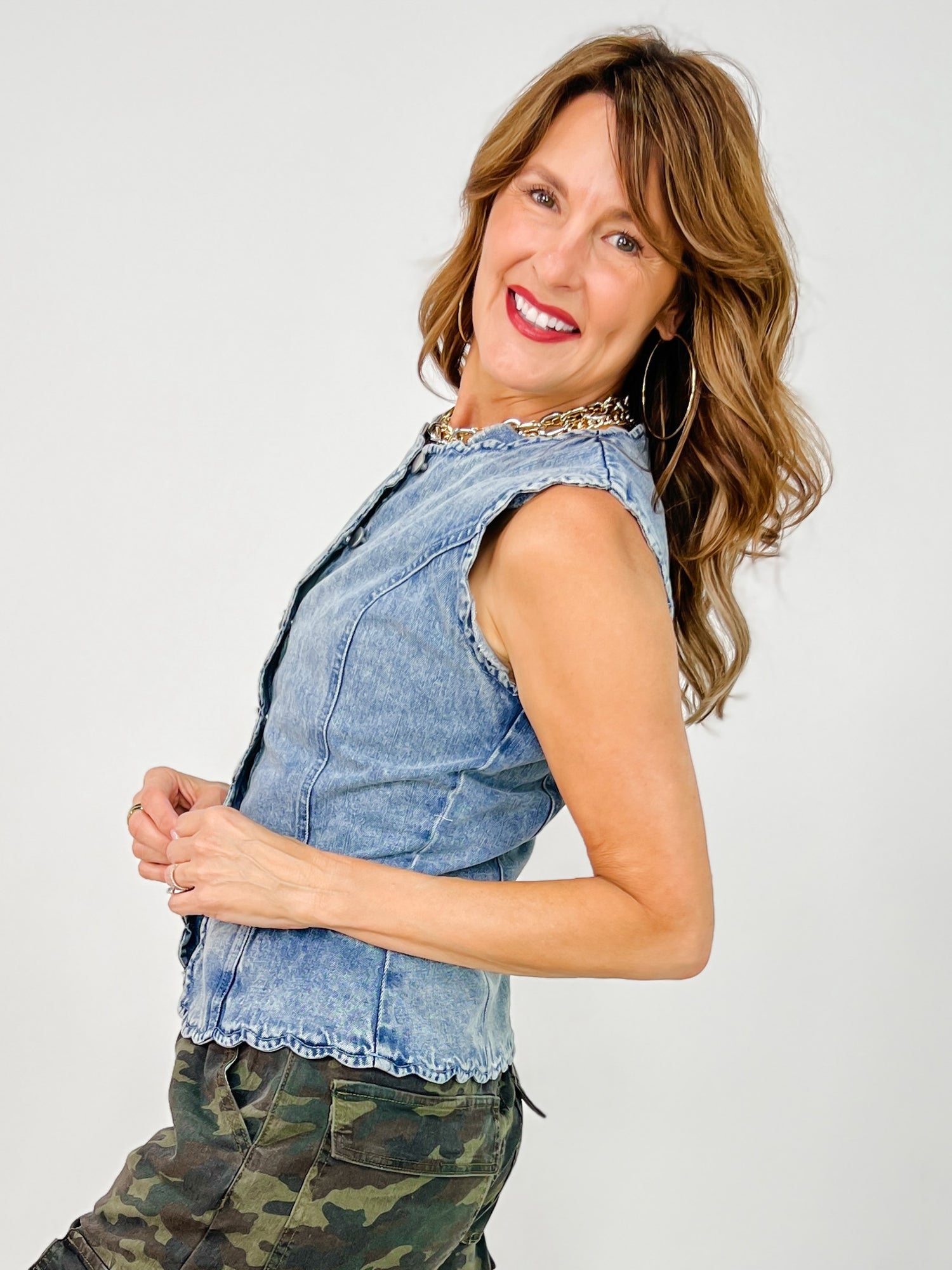 Add a fun twist to your wardrobe with this Button Up Denim Vest featuring charming scallop edge details. Perfect for layering, it brings a playful vibe to any outfit while keeping things cool and casual. Whether you're dressing up or down, this vest adds a unique touch that’s sure to turn heads.