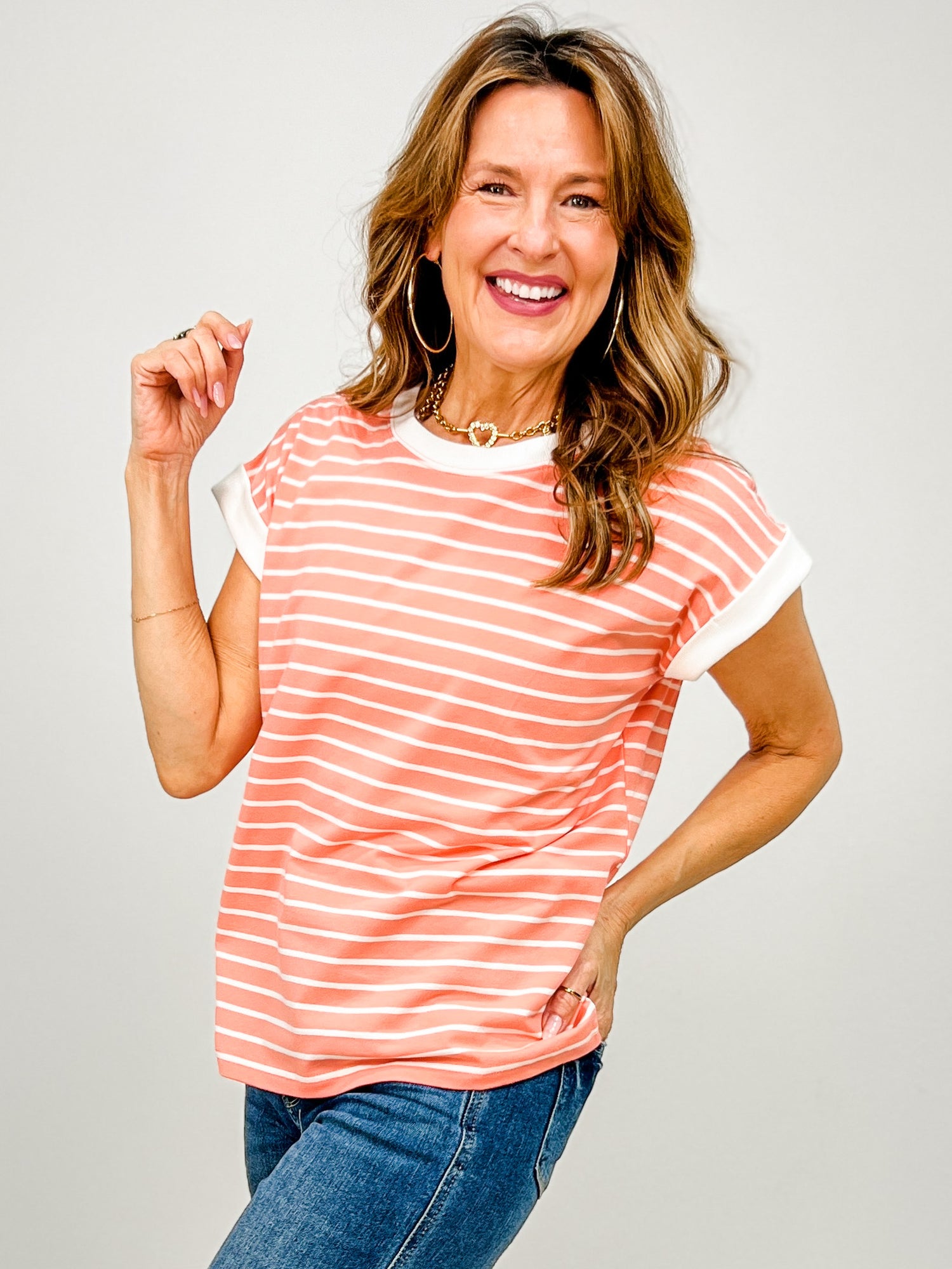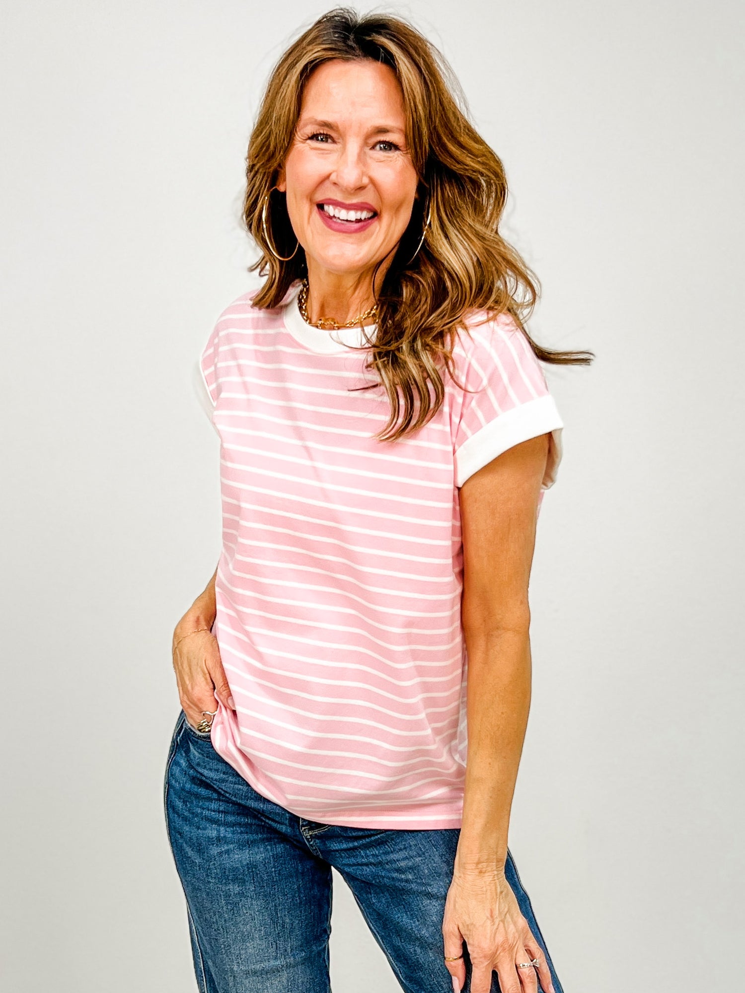 Stripes meet style in this charming cap sleeve top! The classic striped pattern gets a fun twist with contrasting trim that frames the neckline and sleeves, adding just the right amount of visual interest. Perfect for casual days or dressing up with your favorite bottoms, this versatile piece brings effortless charm to any wardrobe. The structured cap sleeves offer a flattering silhouette while keeping things breezy and comfortable.