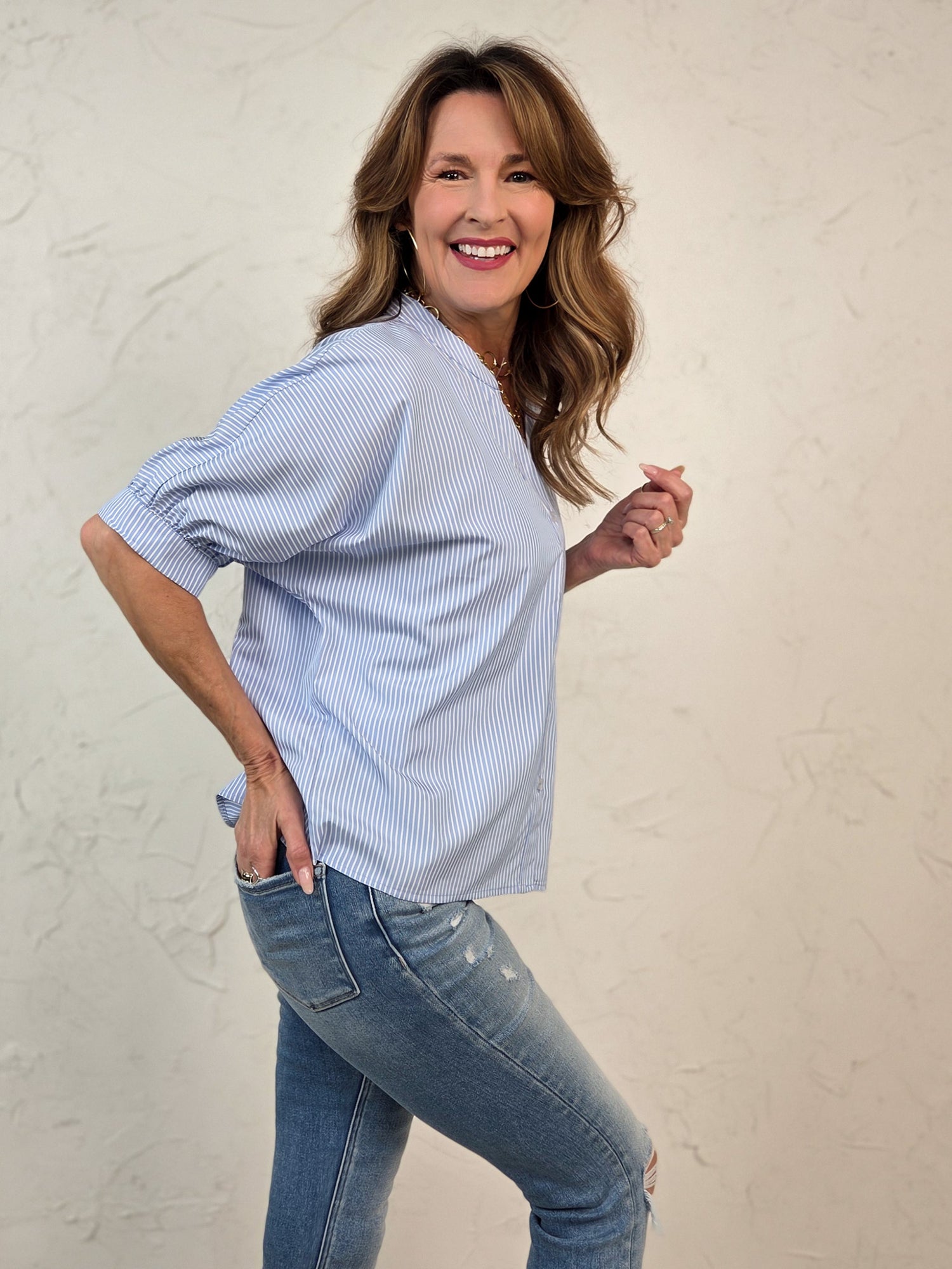 Stripes never looked so sharp! This China collar button-down brings vintage charm with modern edge—crisp pinstripes paired with that distinctive mandarin-style collar for instant sophistication. Perfect for dressing up your everyday look or channeling retro-inspired style. Button down for easy layering, or wear it solo as a statement piece. Whether you're heading to brunch or the office, this top delivers polished appeal with a playful twist.