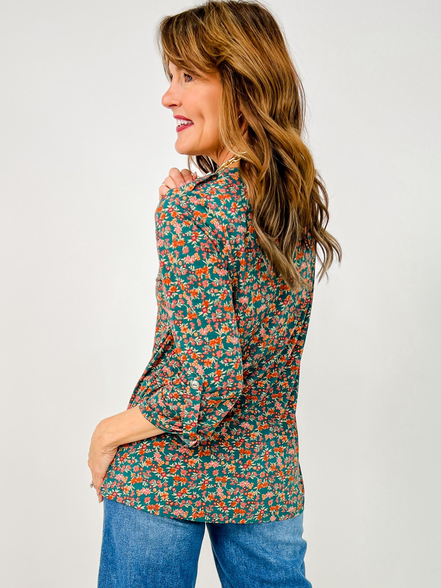 Classic 3/4 Sleeve Lizzy Top in Hunter Green Floral