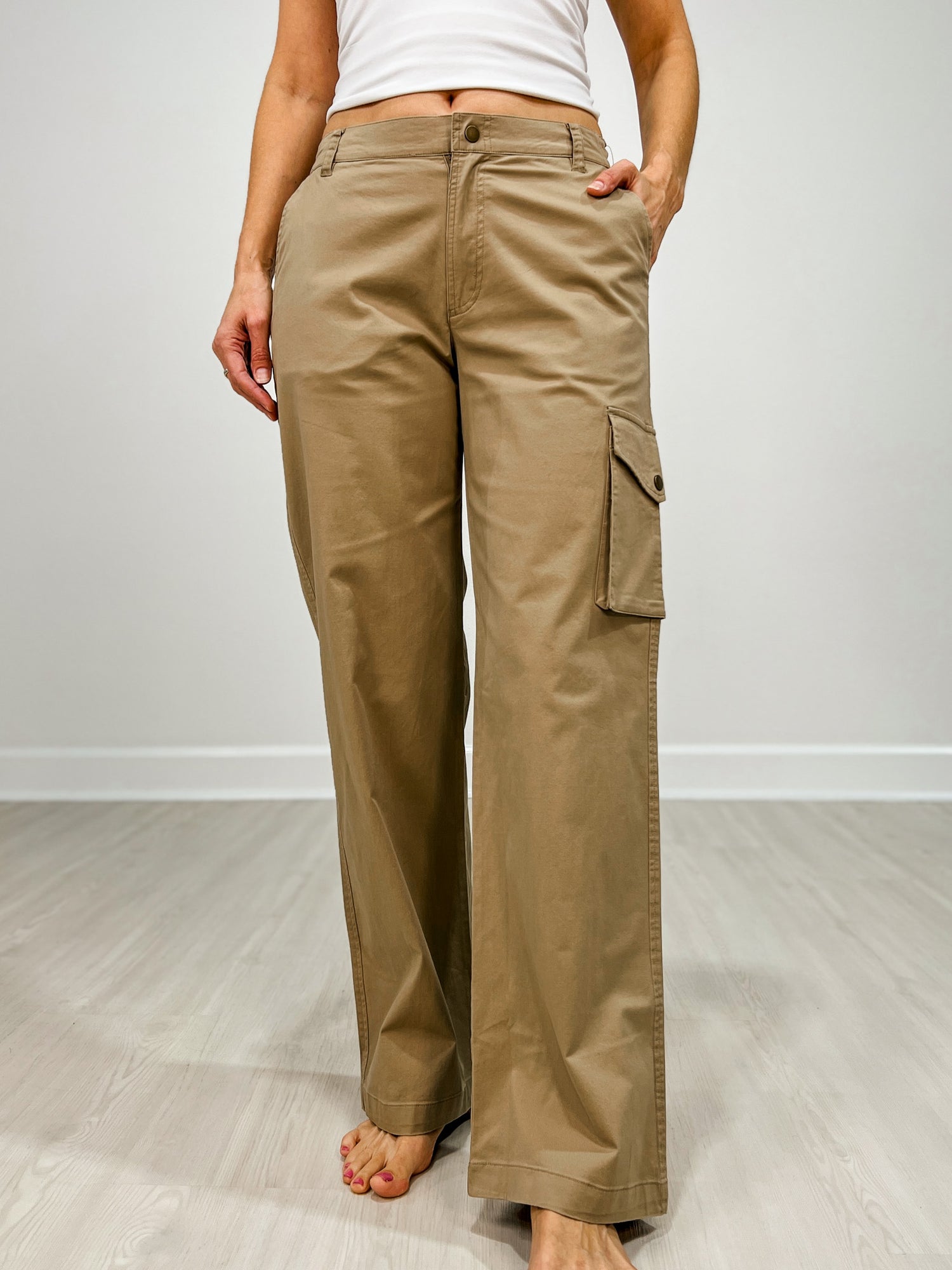 The perfect streetwear style pants. These cargo pants are made from a washed stretch-woven fabric and feature a tailored waistband, functional fly, belt loops, hand pockets, cargo pockets with snap closures, rear flap pockets, and rear stitching for a contoured fit. Pair with a crop top or an everyday tee for an edgy, trendy look.