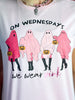 Hauntingly stylish! Elevate your spooky fashion game with this ghostly graphic tee, featuring the iconic phrase 'On Wednesdays We Wear Pink.' A delightful fusion of Halloween vibes and a pop culture reference, this tee lets you embrace the spirit of the season while adding a touch of humor. It's the perfect blend of eerie and iconic, making every Wednesday a fashionable affair