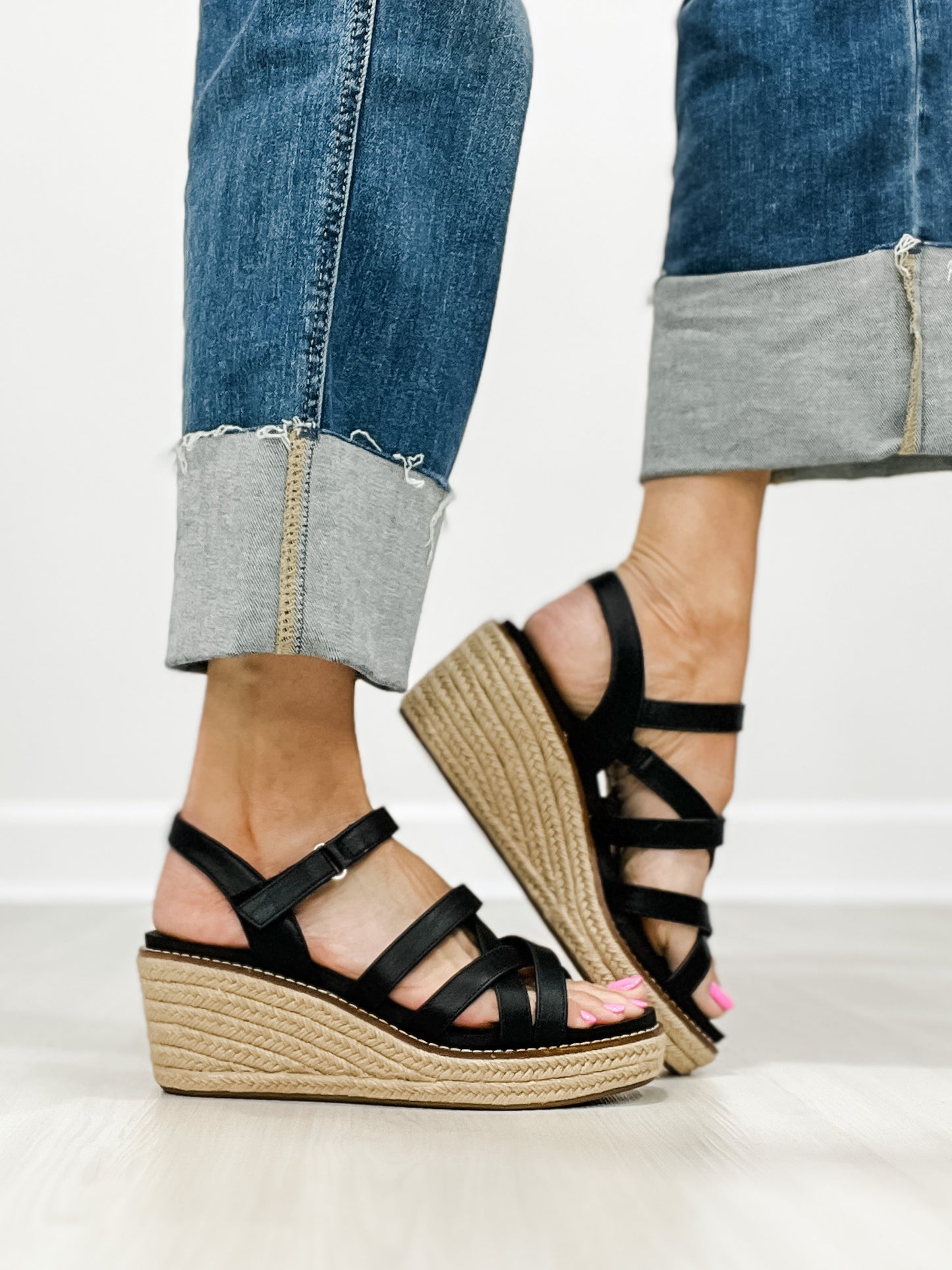 Introducing the Corkys All Nighter Wedge Sandals in black, your go-to footwear for comfort and style. These trendy wedges feature a sleek design with a cushioned footbed and adjustable straps, ensuring a perfect fit all day. The stylish wedge heel adds a touch of elevation without sacrificing stability, making them ideal for any occasion, from casual outings to night events. Pair them effortlessly with your favorite outfits and enjoy all-night comfort in these chic sandals!
