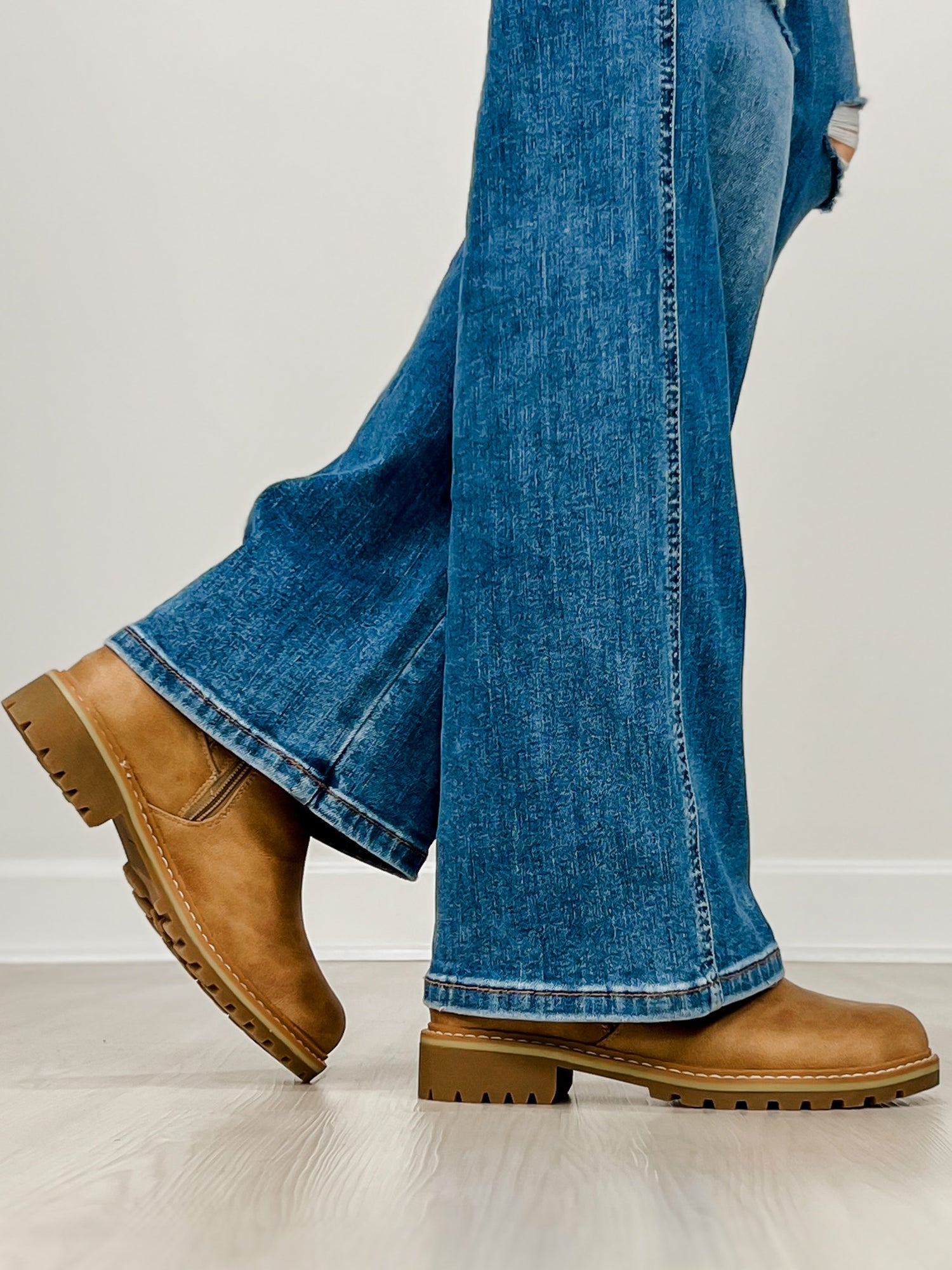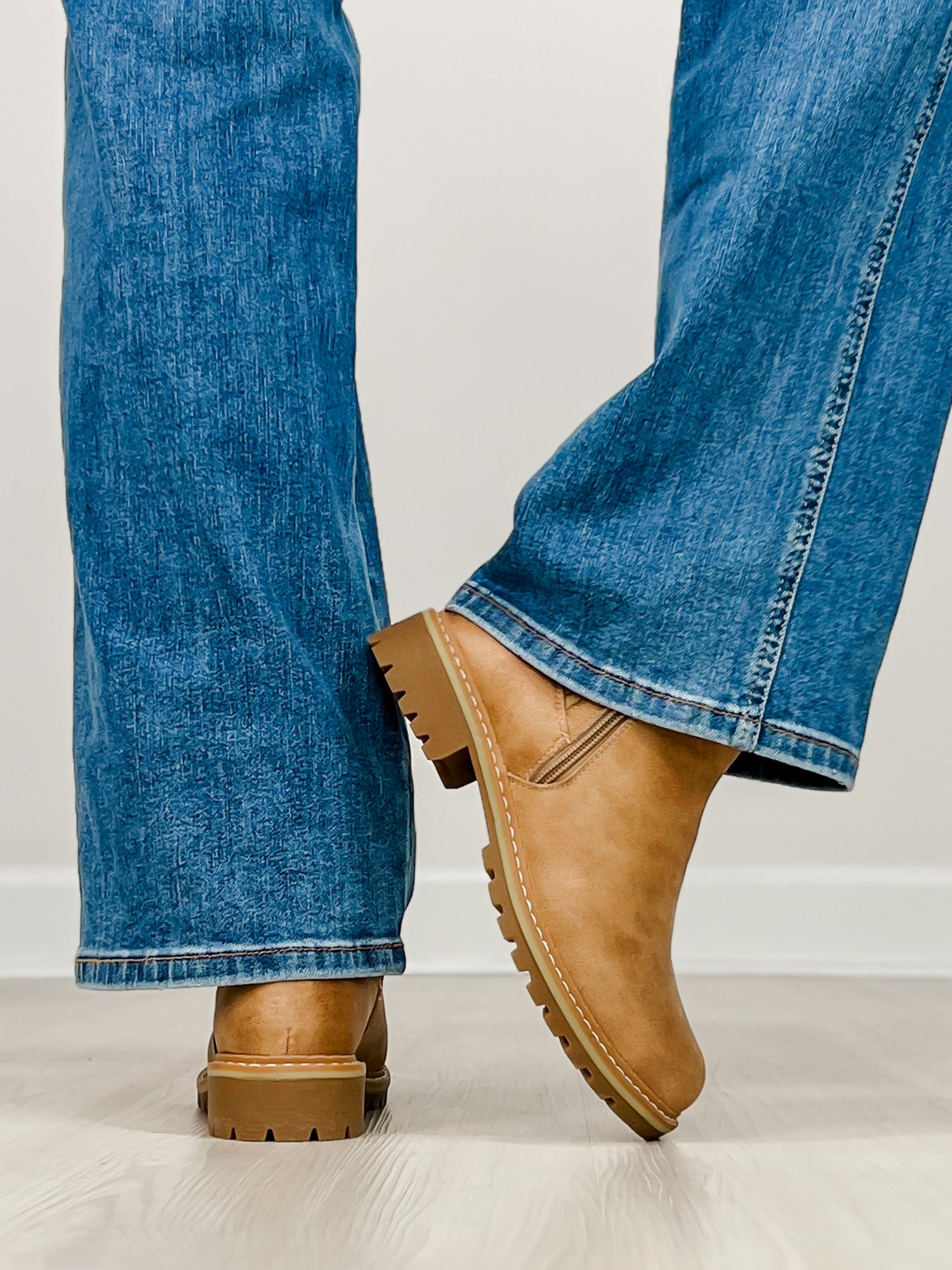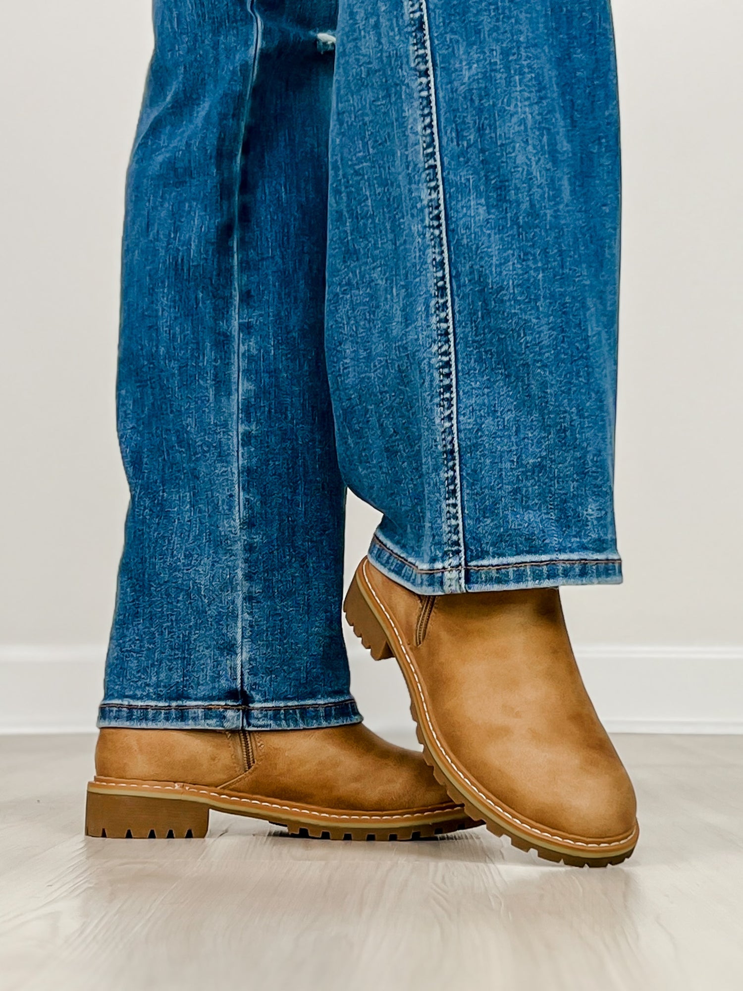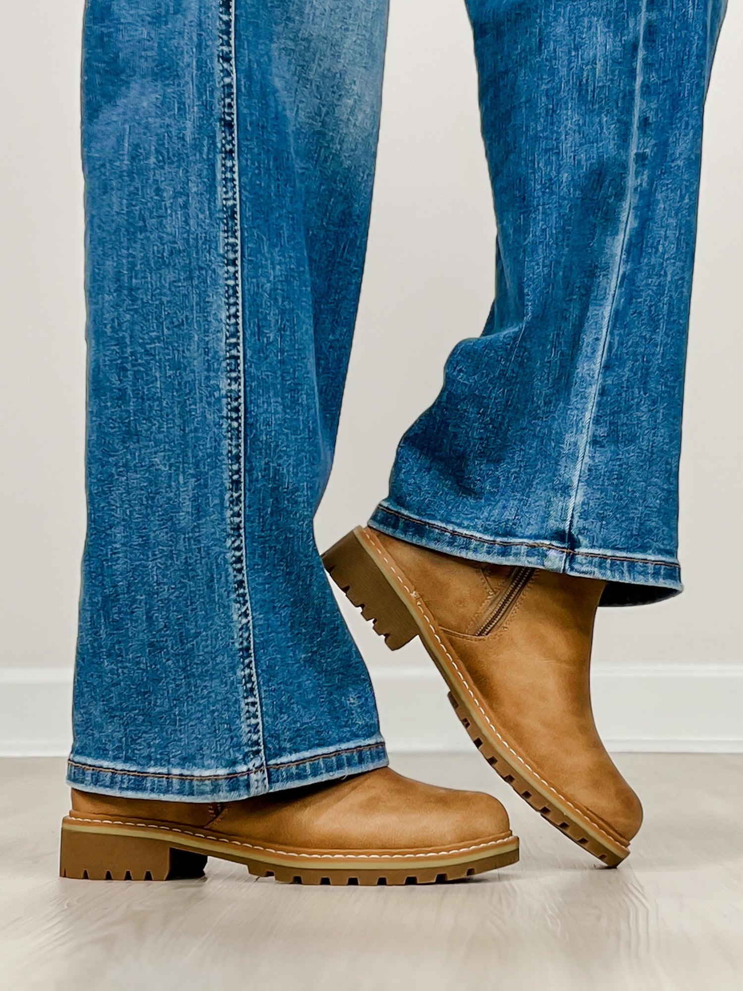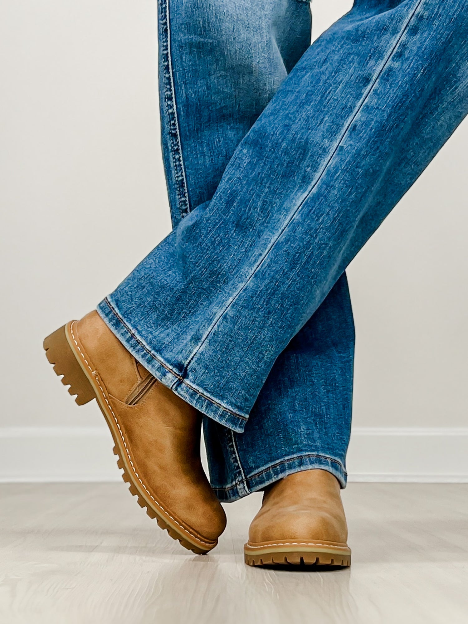 Tough, sleek, and endlessly versatile—the Corkys Don’t Be Difficult boot is your go-to for everyday edge. Crafted in smooth faux leather, this ankle boot features a chunky lug sole for traction and durability, with ribbed stretch side panels for a comfortable fit. The inside zipper makes slipping them on and off a breeze, while the contrast stitching adds a stylish finishing touch. Perfect for pairing with skinny jeans, leggings, or flowy dresses, this boot balances comfort with attitude.