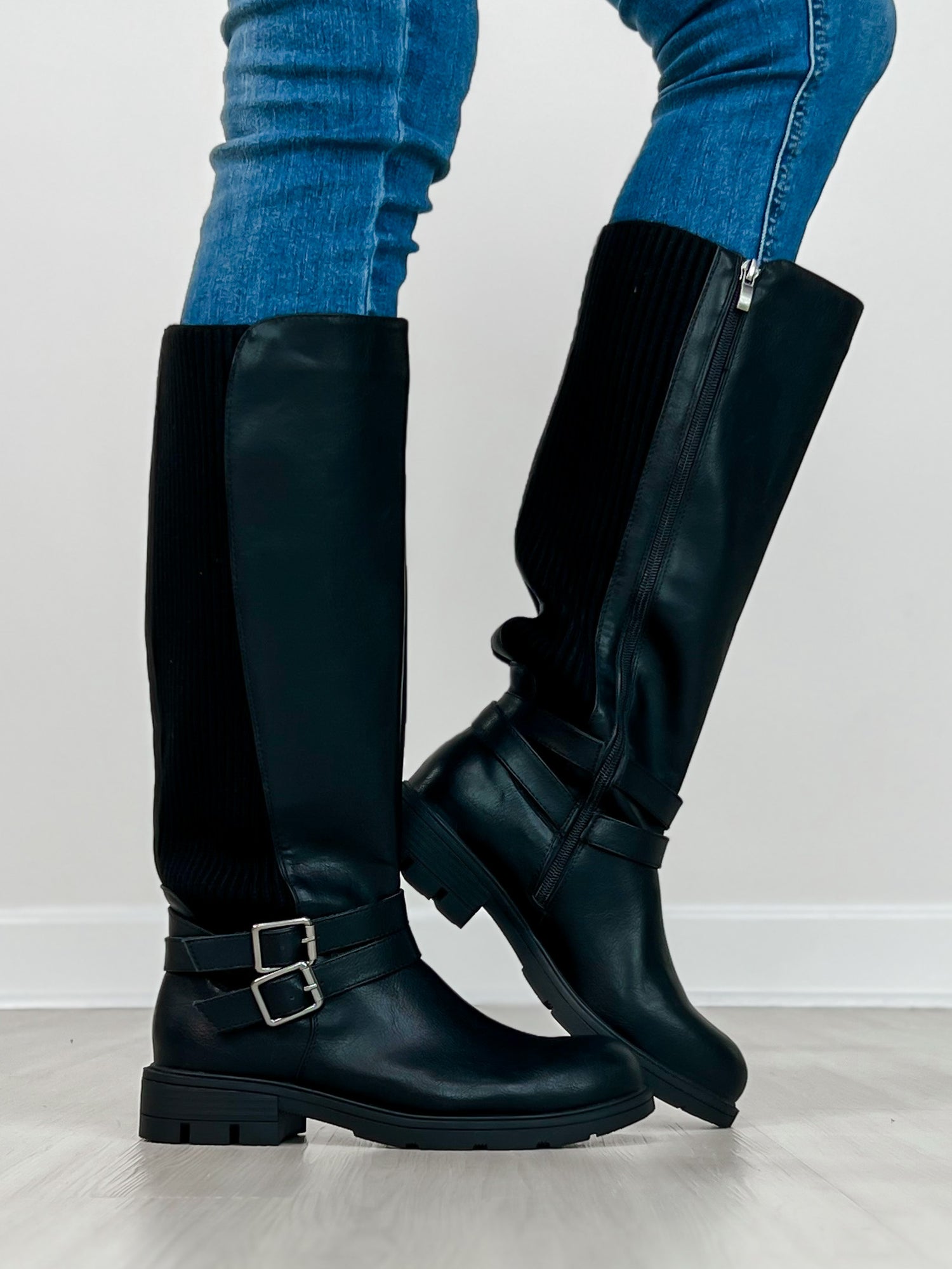 Rugged style meets everyday versatility with the Corkys Hay Bale Boots. Featuring a tall silhouette in a distressed crinkle faux leather finish, these boots are designed with a ribbed stretch panel for flexible comfort and a secure fit. Double buckle strap details add a touch of rustic charm, while the sturdy lug sole and low block heel provide stability and all-day wearability. Perfect for pairing with jeans, leggings, or cozy fall layers, these boots are made to take you from countryside strolls to city streets in style.
