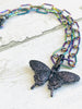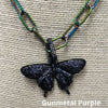 Gold Butterfly on Gold chain, Silver Butterfly on Silver chain, Purple Butterfly on Gunmetal chain and Rose Gold Butterfly on a silver chain.