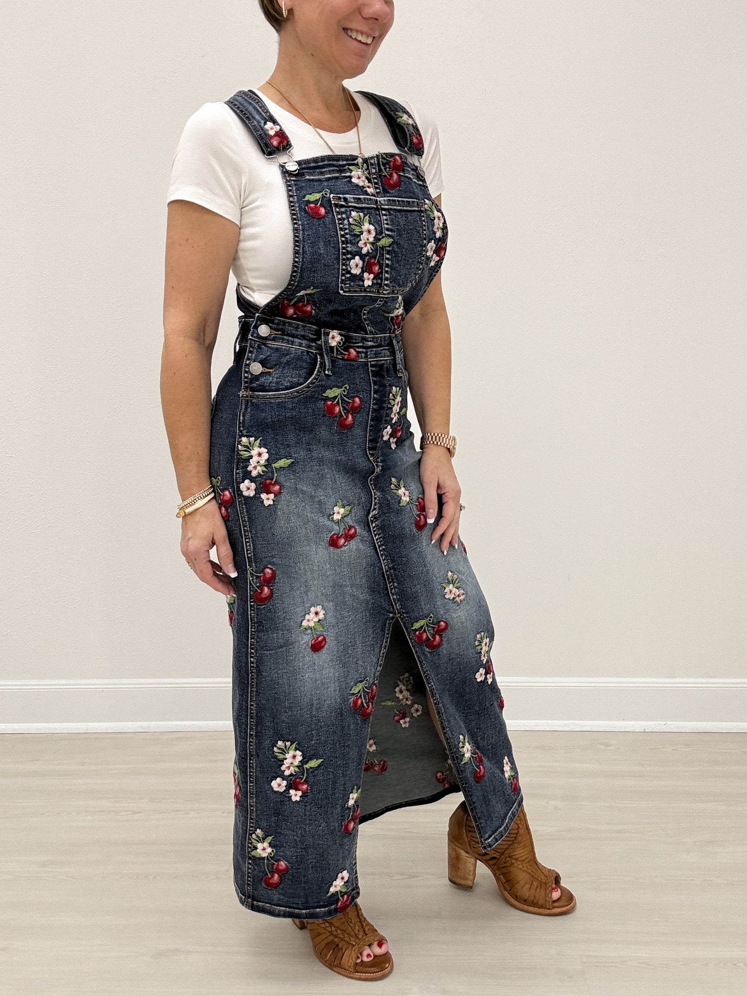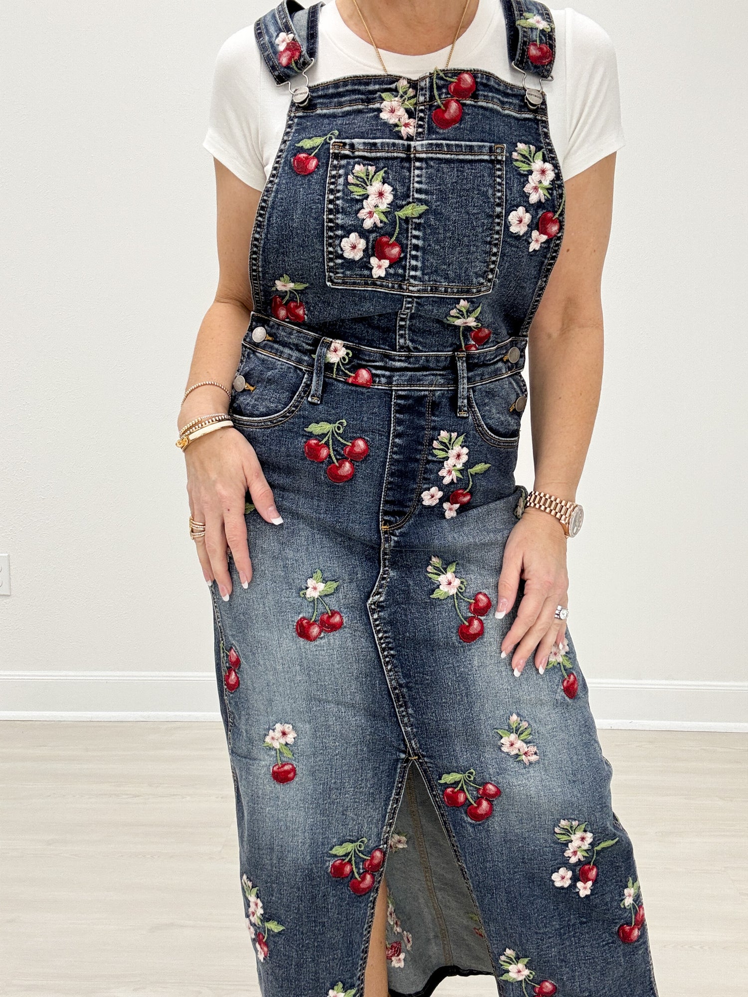 • Details: Dark wash denim, cherry embroidery with all-over placement, adjustable shoulder straps, front bib pocket, classic five-pocket styling, side button closures, slightly cropped length at the ankle