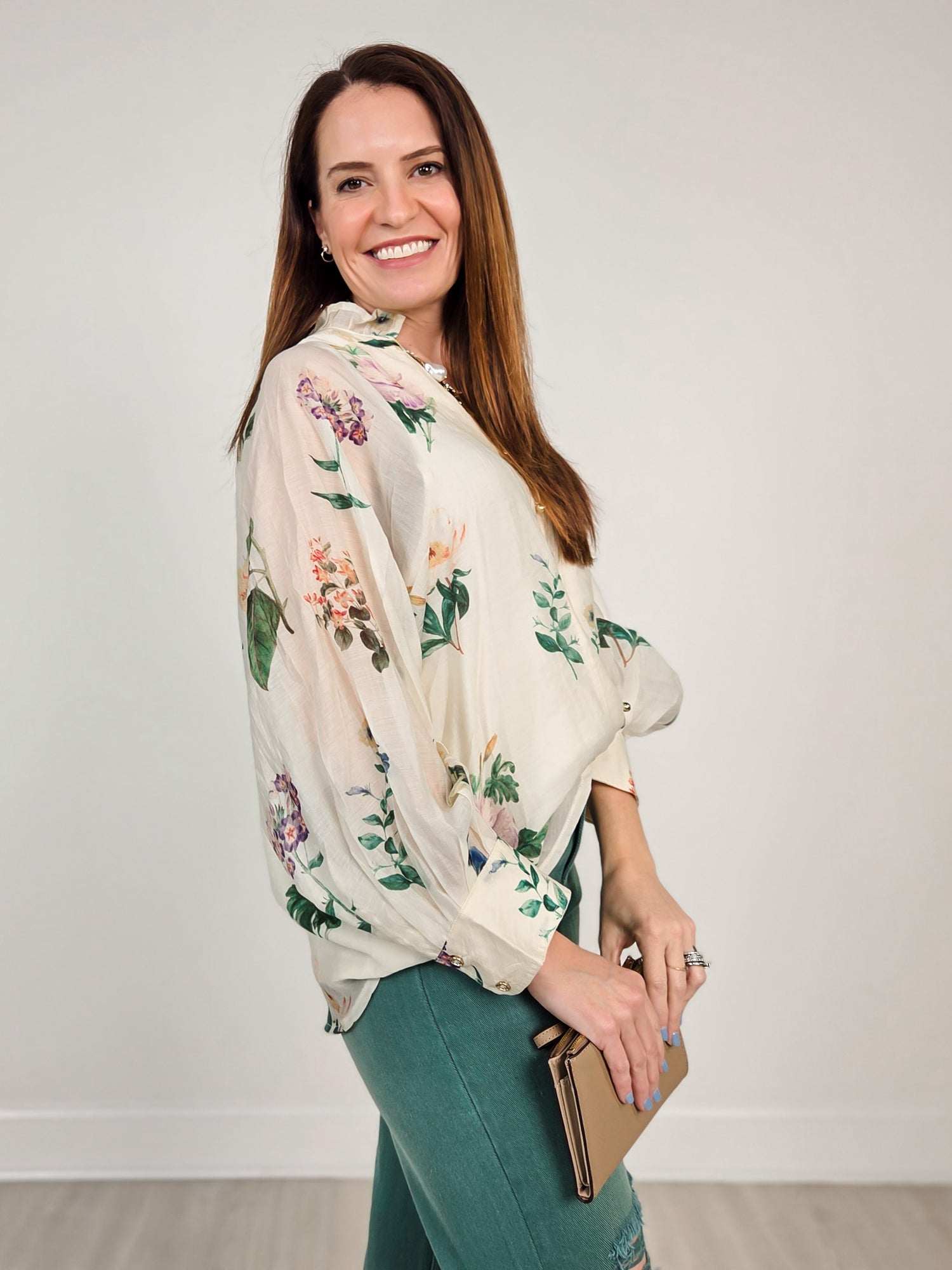 Bloom into spring with this charming floral top that's equal parts romantic and fun. The dramatic puff sleeves add a whimsical touch, while the ruffled neckline frames your face beautifully. Button-front styling makes it easy to dress up or down—pair it with jeans for casual vibes or tuck it into a skirt for something more polished. Perfect for anyone who loves a little personality in their wardrobe.