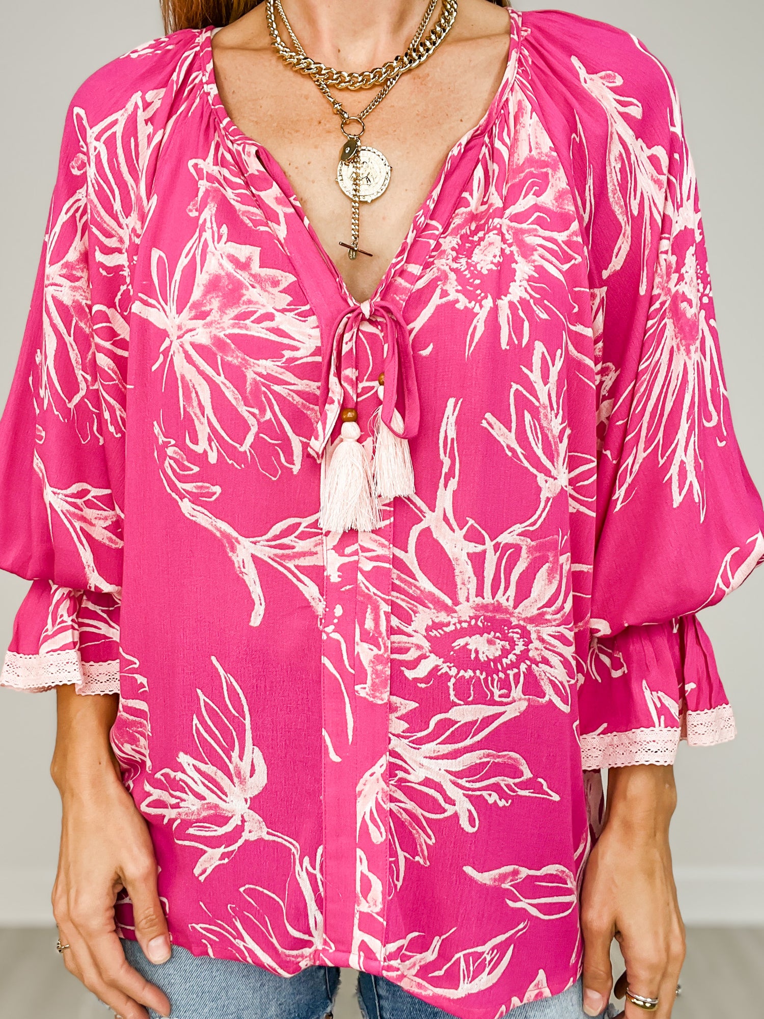 Floral Print 3/4 Sleeve Flutter Hem Top