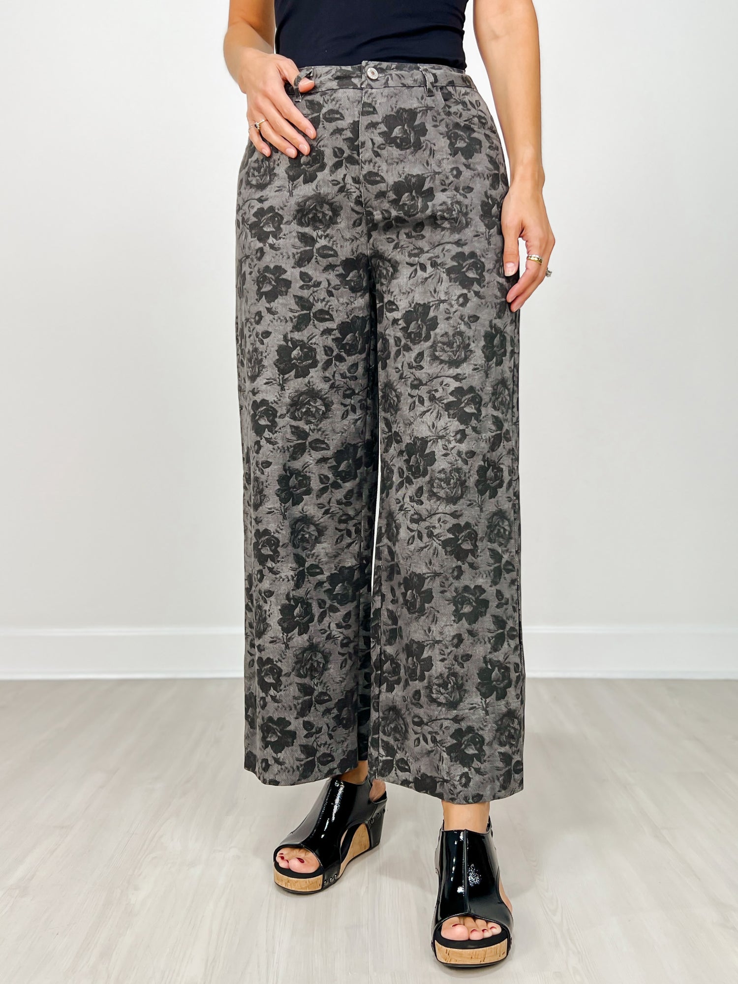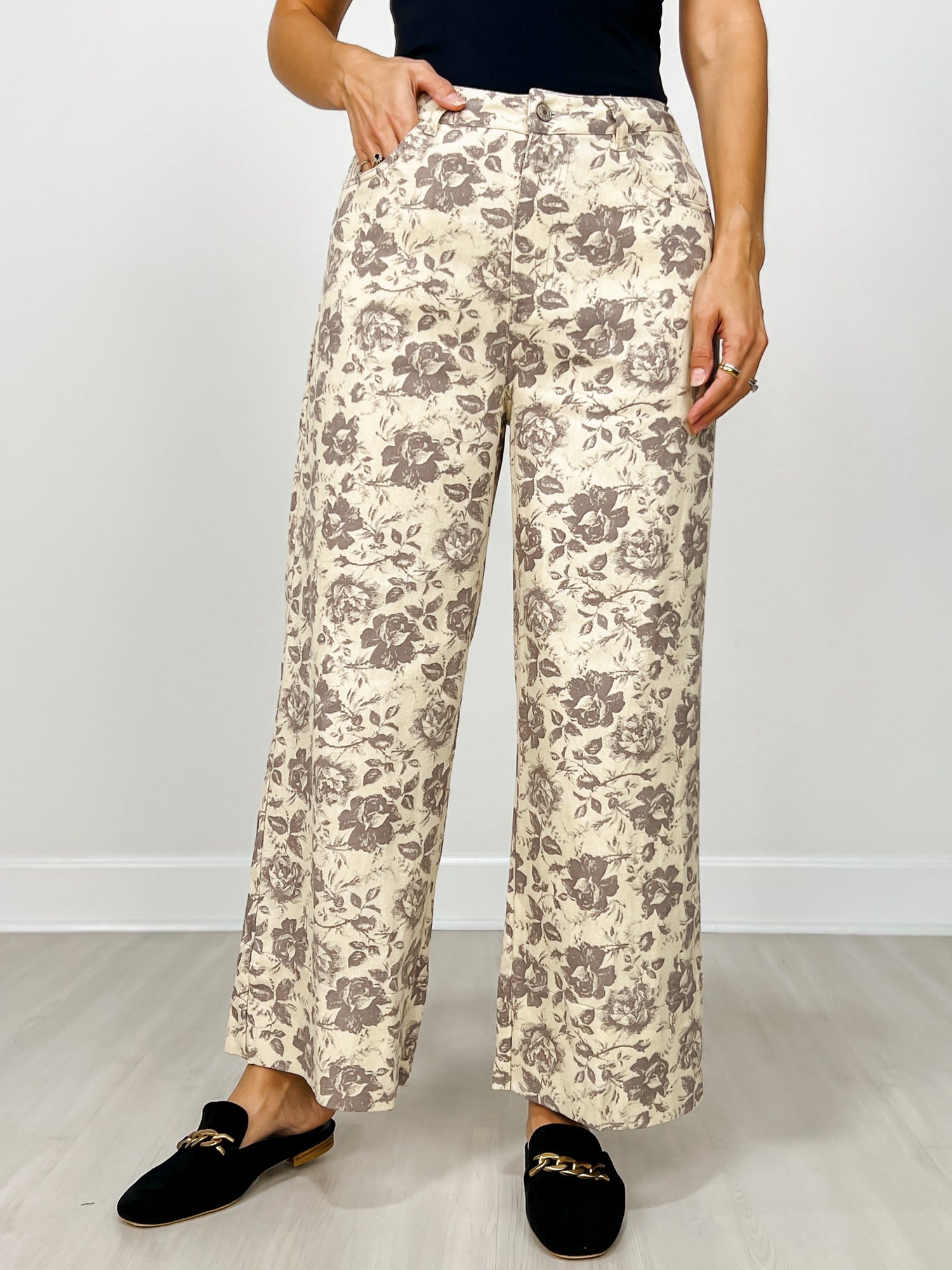 Floral print ankle-length pants. Button fly-front zipper closure. Pockets at sides and back patch pockets. Unlined. Woven. Non-sheer. Lightweight.