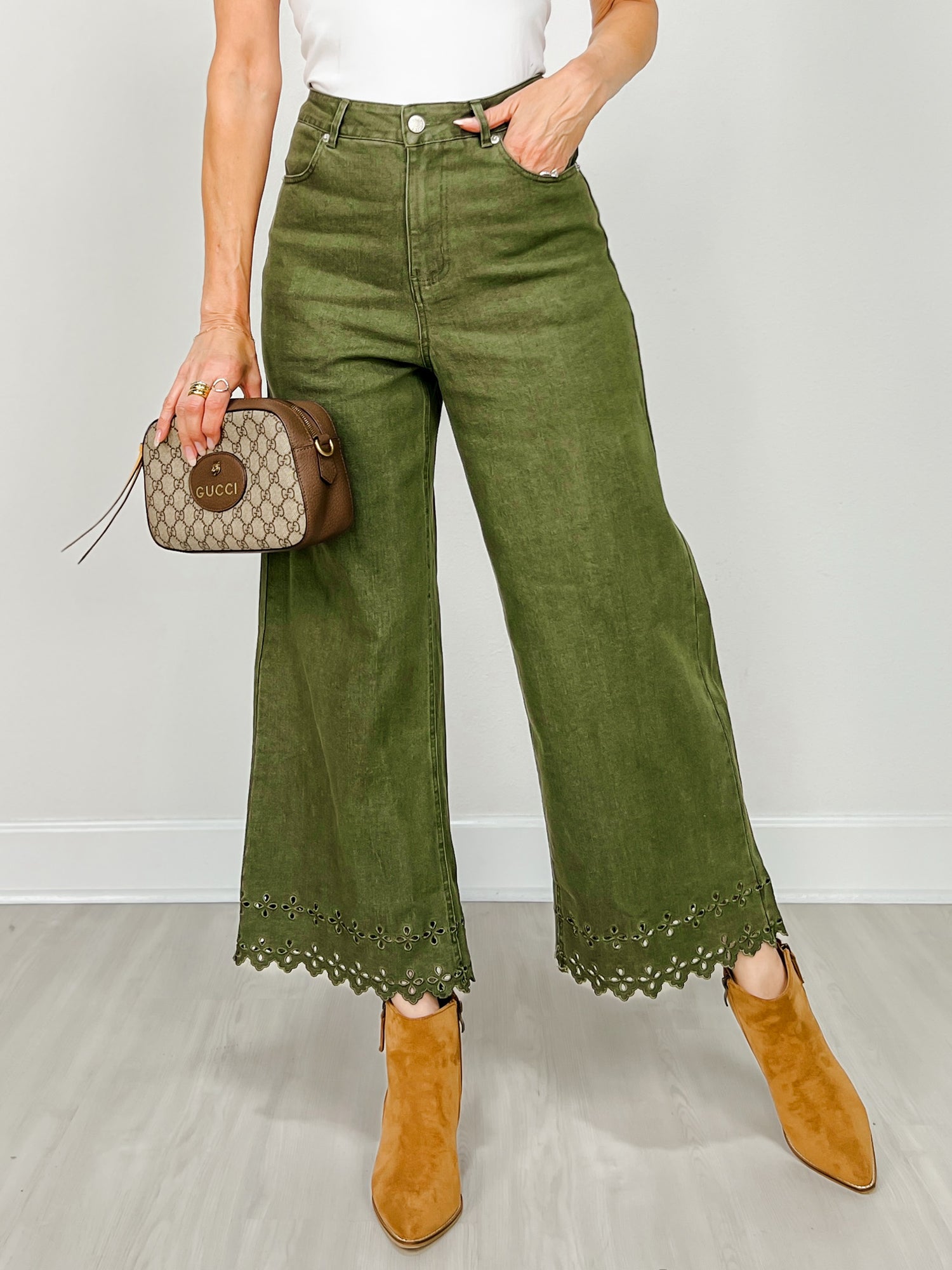 Elevate your everyday style with these chic high-waist ankle pants featuring a delightfully scalloped hem that adds a touch of whimsy to your wardrobe. The flattering high-rise cut creates a polished silhouette while the cropped length keeps things modern and on-trend. Perfect for dressing up or down, these pants bring personality to any outfit—because who says practical can't be playful?
