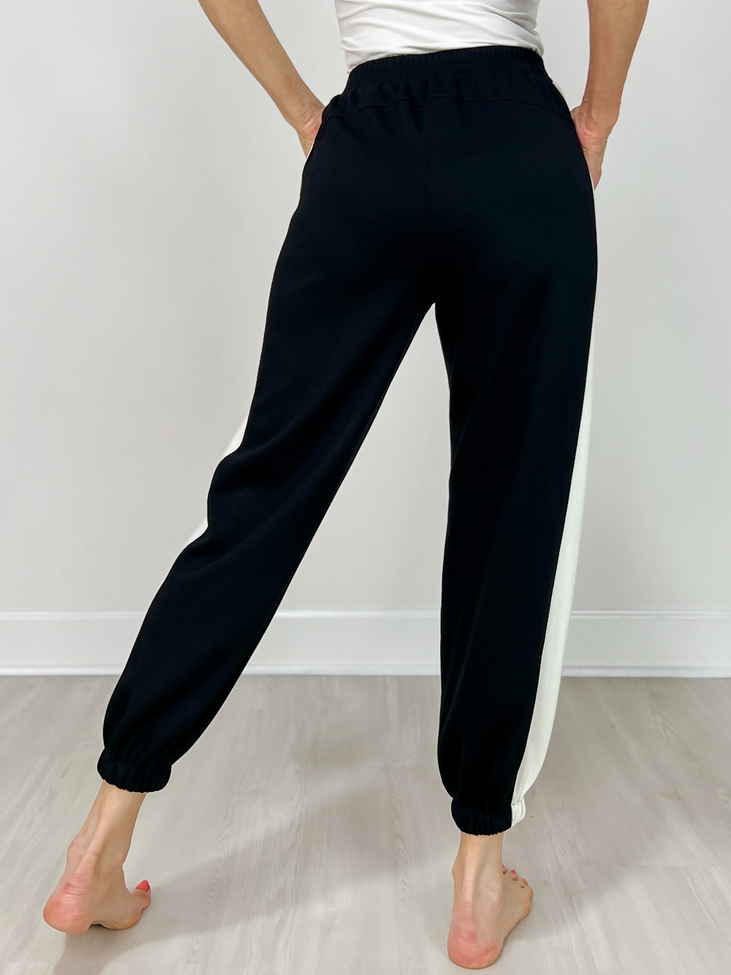 These Black and White Side Stripe Jogger Pants bring sporty style with a chic twist. Featuring a comfortable elastic waistband, relaxed fit, and bold white side panels, these pants offer an elongating effect and a casual edge. The elasticized cuffs add a classic jogger finish, making them perfect for both lounging and streetwear-inspired looks.