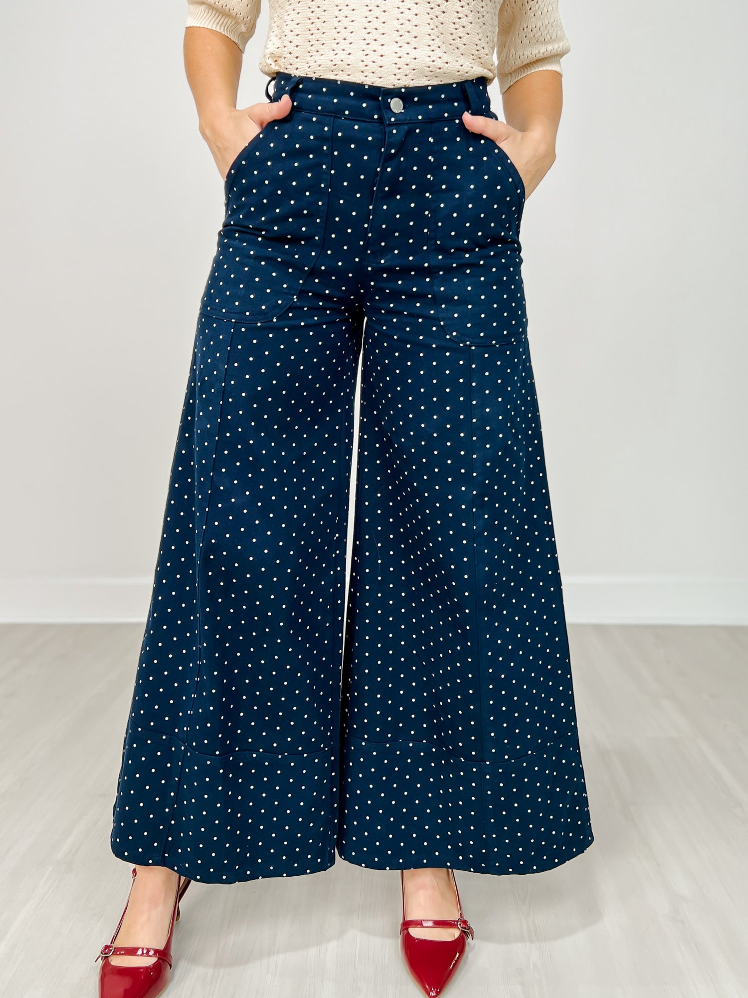 These playful wide-leg pants bring effortless retro charm to any outfit. Crafted in a deep navy fabric sprinkled with a delicate micro-dot print, they strike the perfect balance of fun and sophistication. The high-rise waist and structured front pockets add a flattering, tailored touch, while the ultra-wide silhouette creates beautiful movement with every step. Finished with a clean front closure and stitched panel detailing at the hem, these statement pants elevate even the simplest tops.