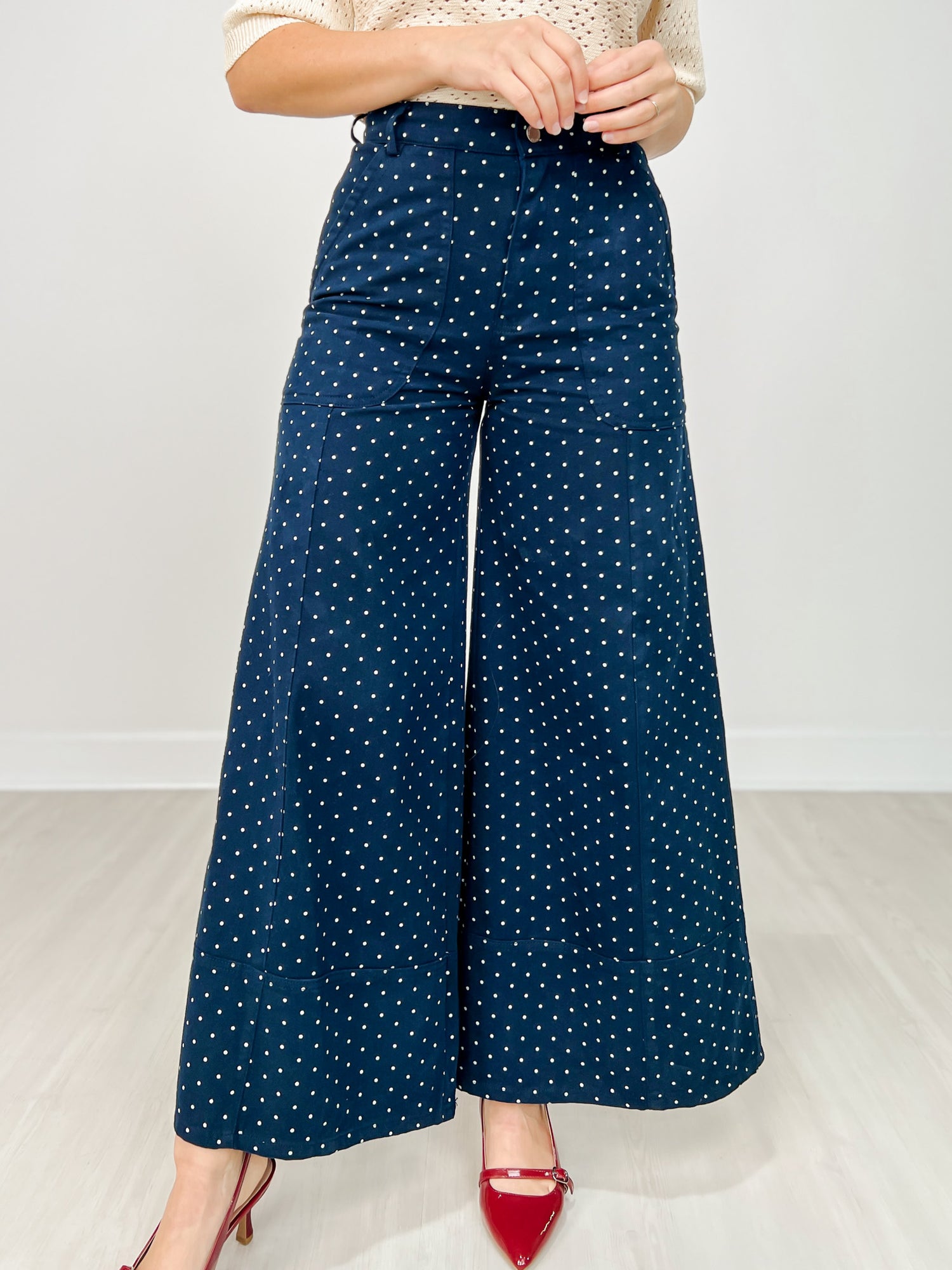 High Waist Wide Leg Pants with Roomy Front Pockets in Navy Dot