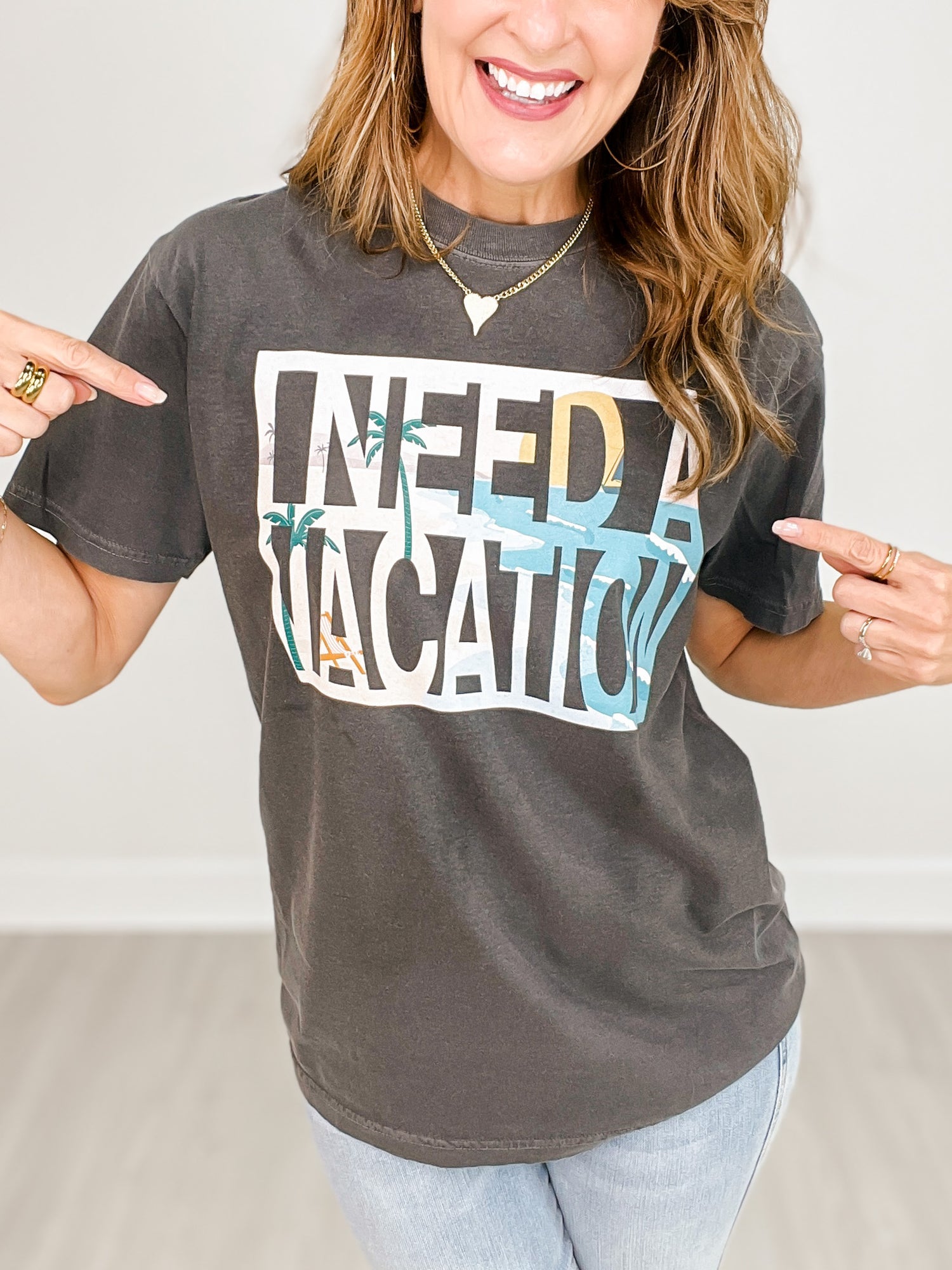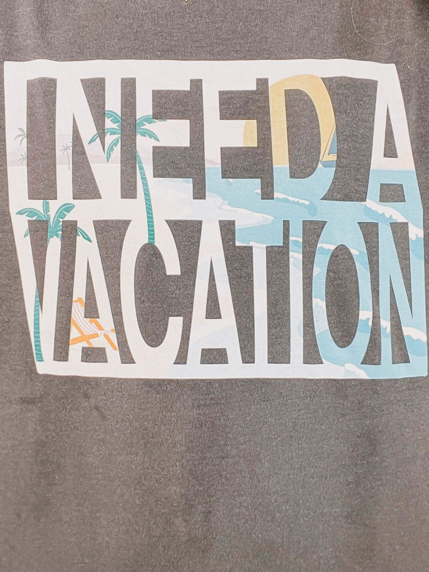 Say it loud, say it proud: “I NEED A VACATION.” This charcoal tee packs a tropical punch with beachy scenes hidden inside bold block letters. Palm trees, ocean waves, and a whole lotta mood—just waiting for your OOO email to go live.