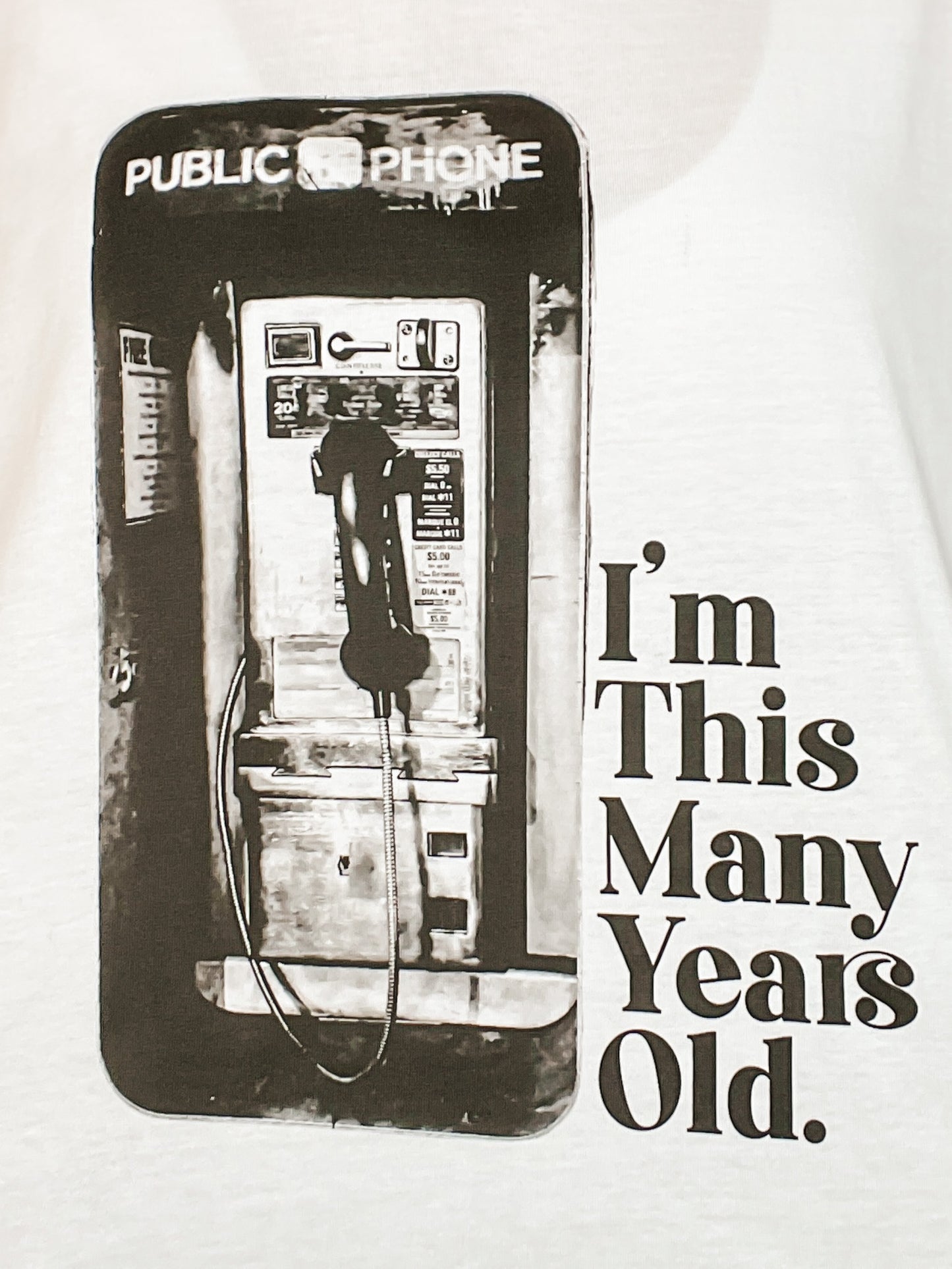 Throw it way back with this cheeky tee featuring a nostalgic photo of a public payphone paired with the phrase “I’m This Many Years Old.” It’s the perfect nod to analog days and simpler times—ideal for anyone who remembers dialing collect, carrying quarters, or hearing a dial tone.