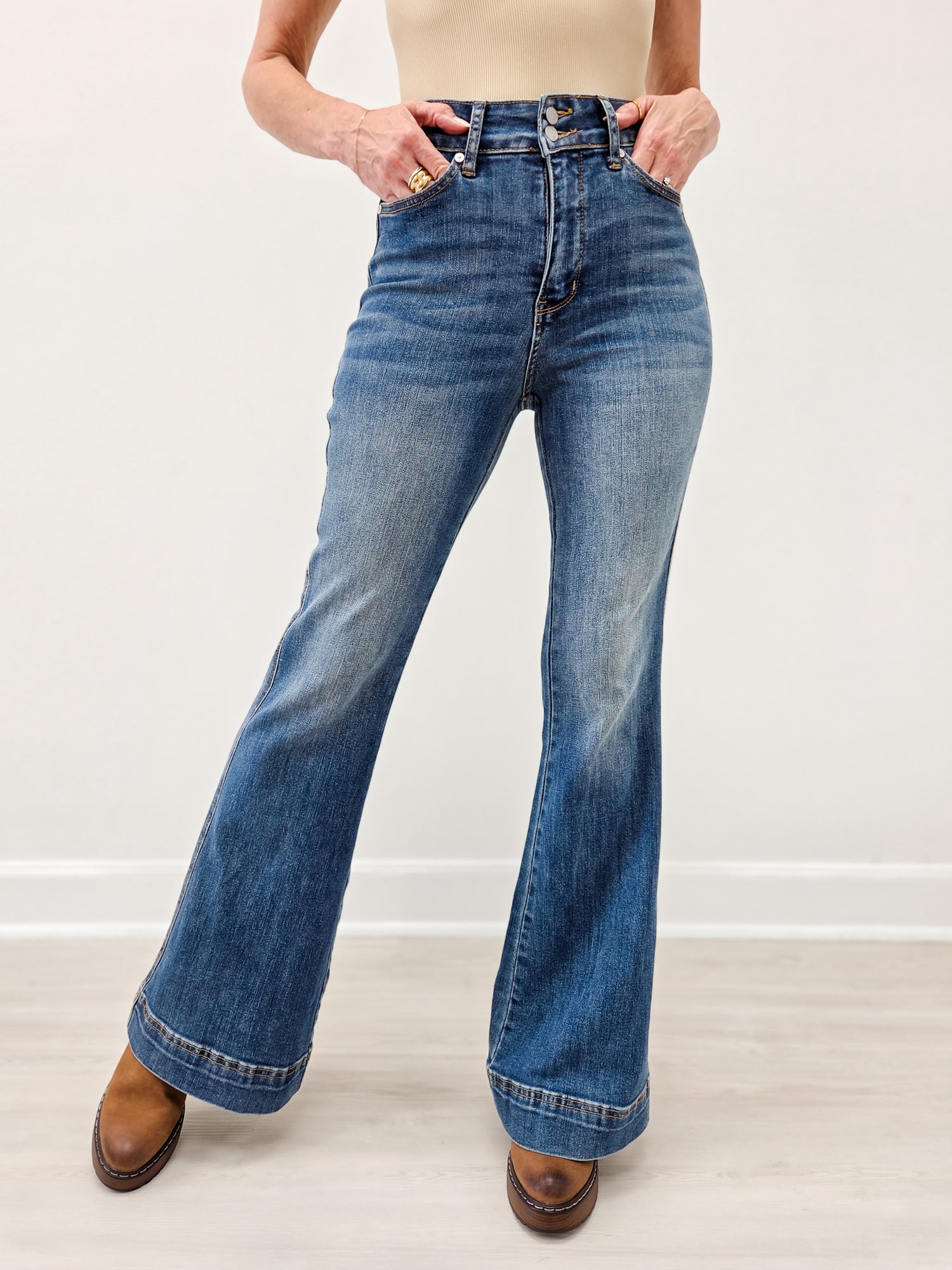 [message]The Judy Blue High Waist Flare Tummy Control Double Button Jeans are the perfect mix of flattering fit and modern style. Designed with a high-rise waist and Judy Blue’s signature tummy control technology, these jeans smooth and shape for a confident look. The double button closure adds a chic touch while ensuring a secure fit, and the flare leg silhouette elongates the figure with timeless appeal. Crafted from soft, stretchy denim, they move with you and keep their shape all day long—ideal for dressing up with heels or styling casually with sneakers.