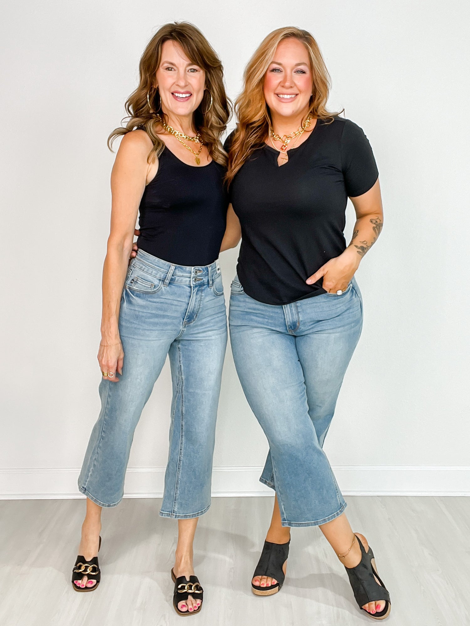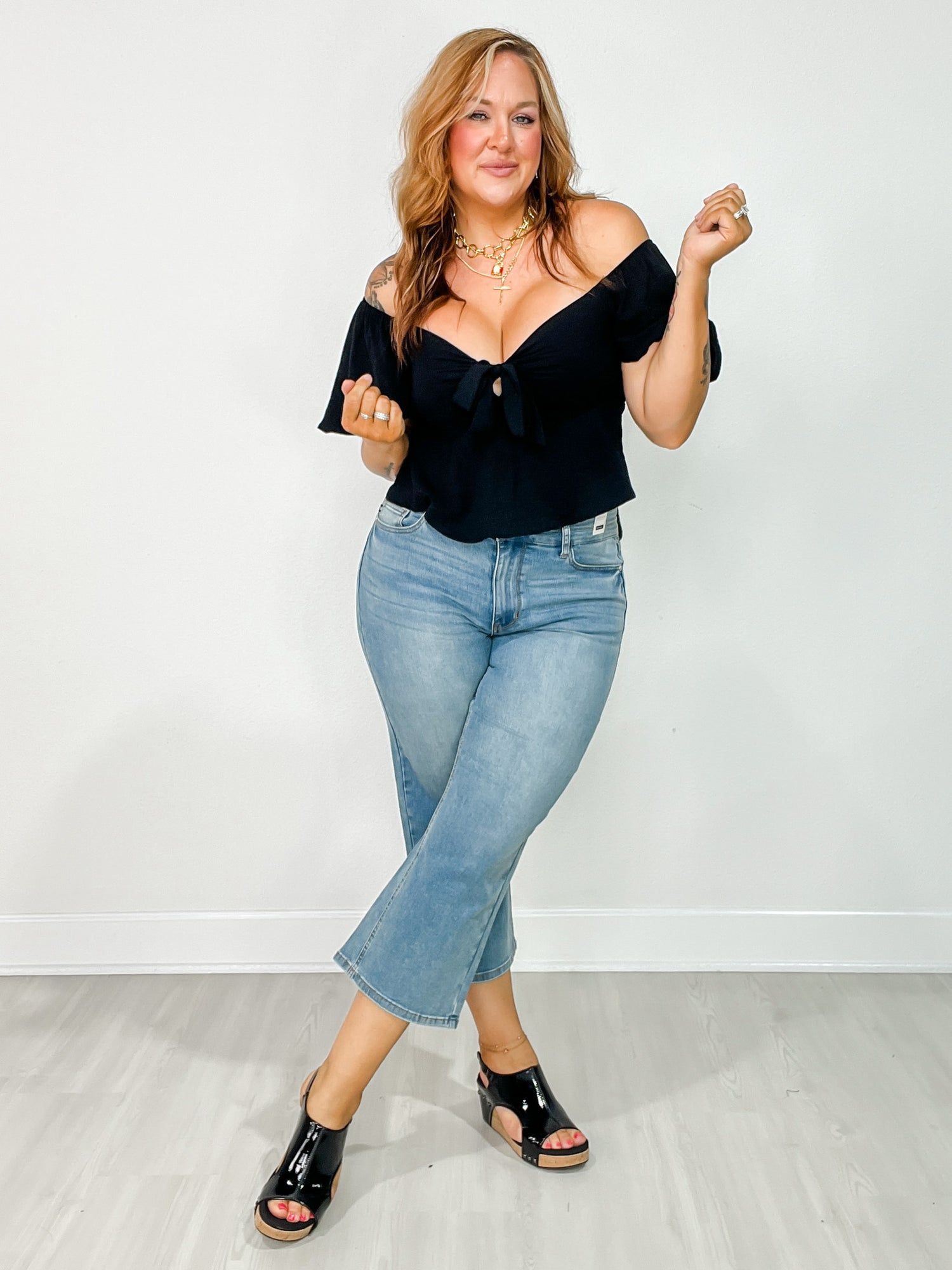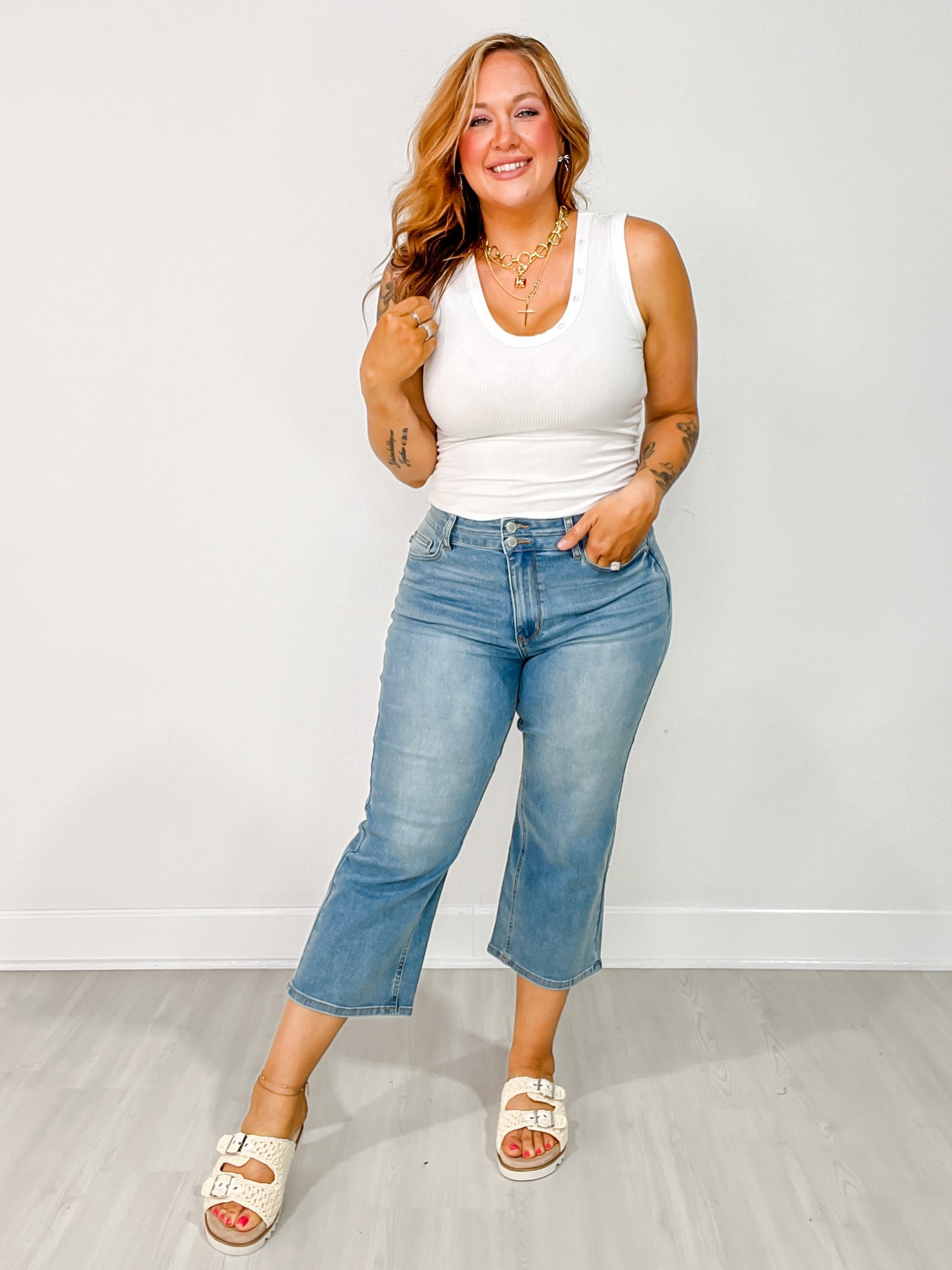 Elevate your denim game with the quirky and playful Judy Blue EDEN Hi-Rise Double Waistband Crop Wide Leg Denim Jeans! These jeans not only feature a unique double waistband for added style and a flattering high-rise fit, these jeans also feature a cooling technology and moisture-wicking fibers to keep you cool during hot summer days. The wide-leg crop design adds a touch of trendiness to any outfit. Say goodbye to boring jeans and hello to fun fashion!