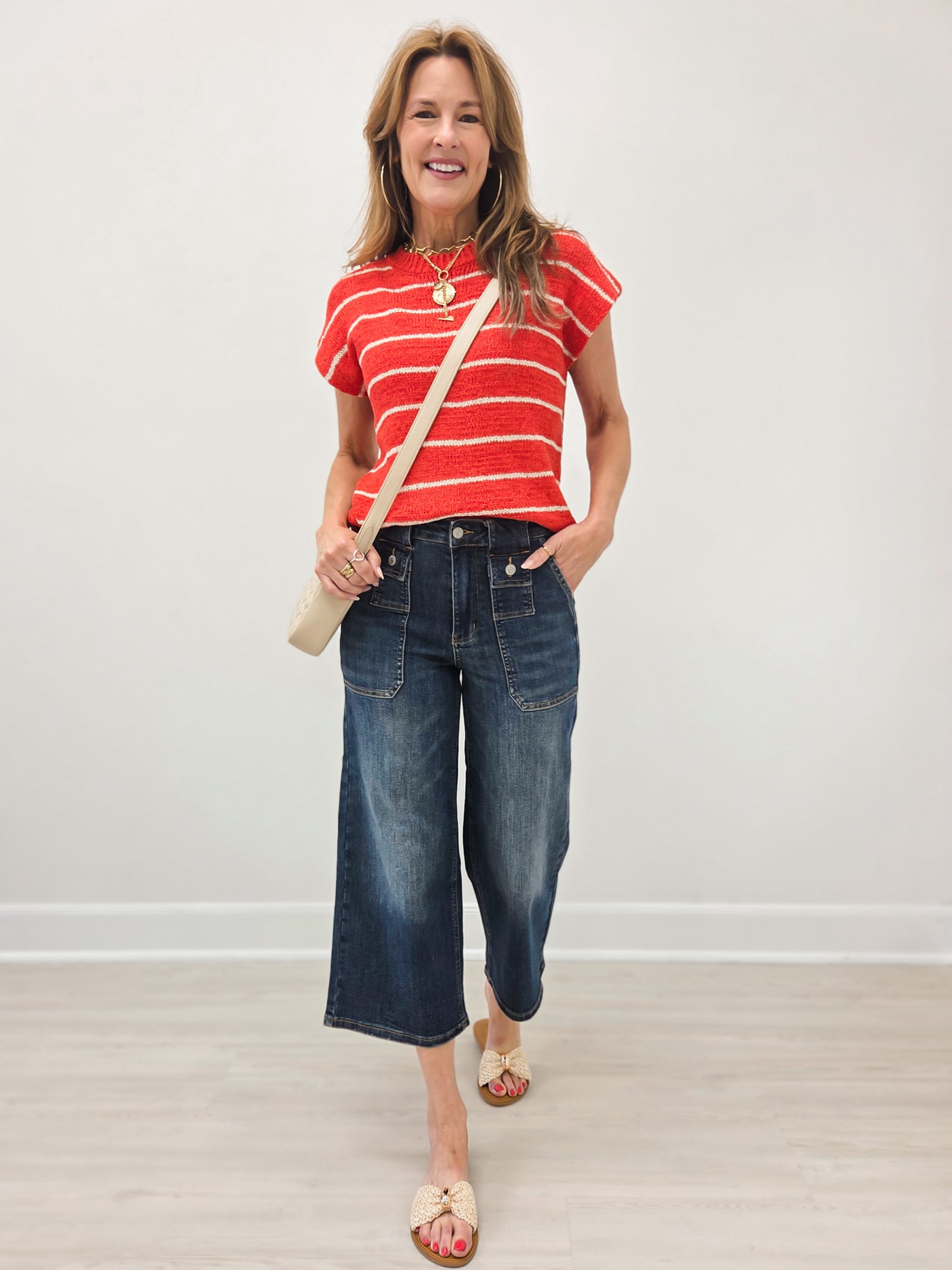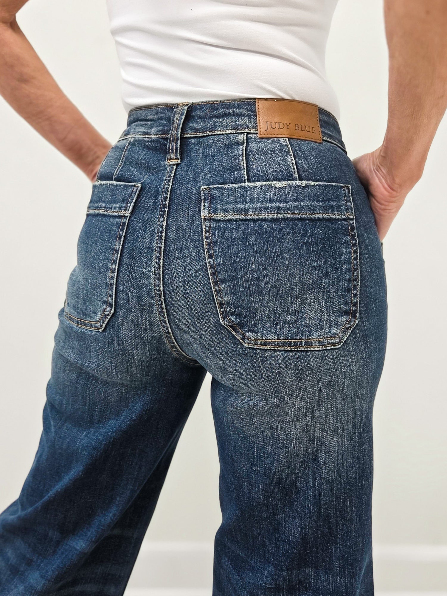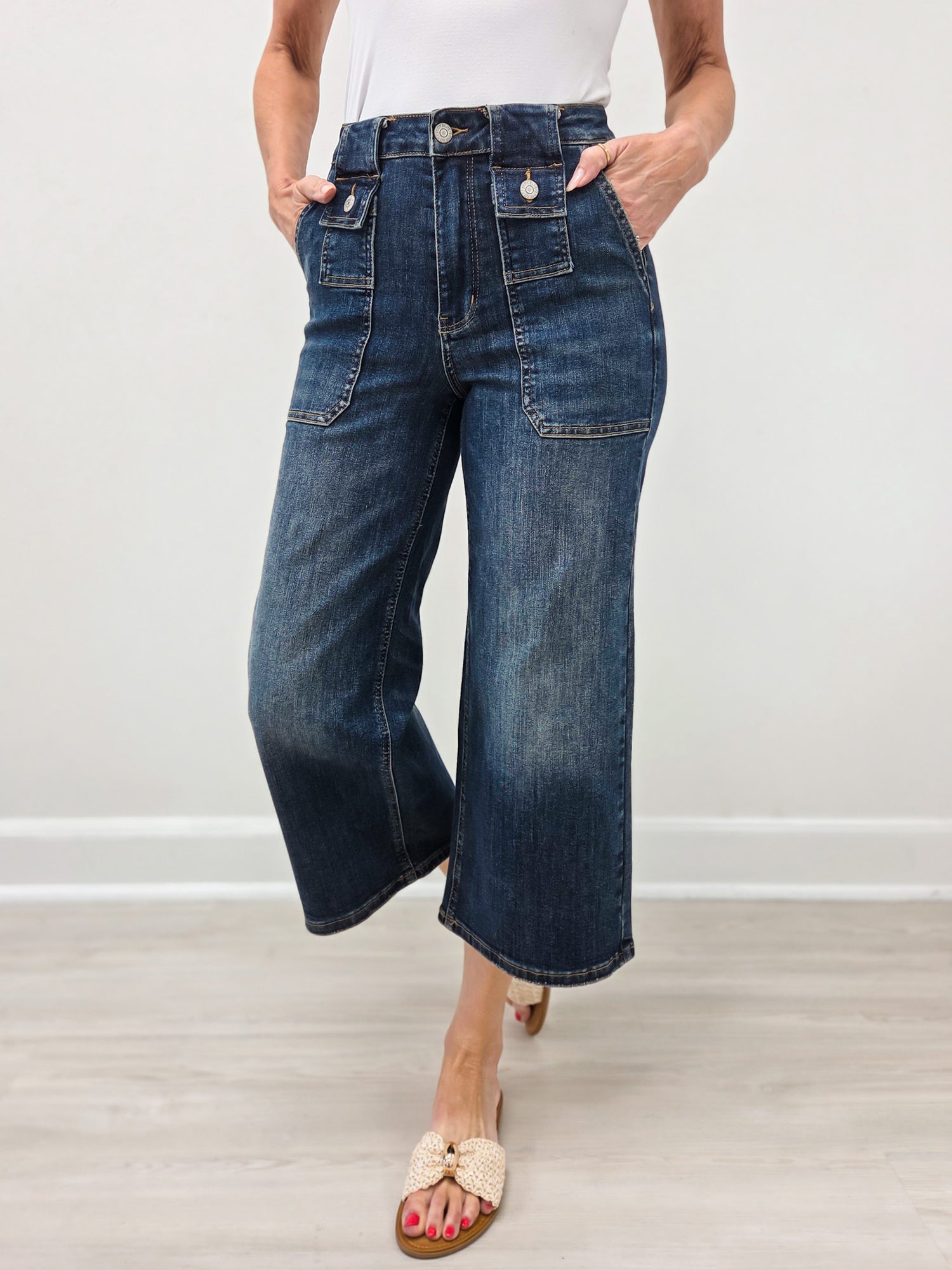 A modern take on classic denim. These high-rise cropped jeans feature statement front patch pockets with button flap details for a unique, utility-inspired look. The relaxed straight leg and ankle-length hem make them easy to style with everything from sandals to sneakers. Comfortable stretch denim keeps the fit flattering while still feeling easy to wear all day.