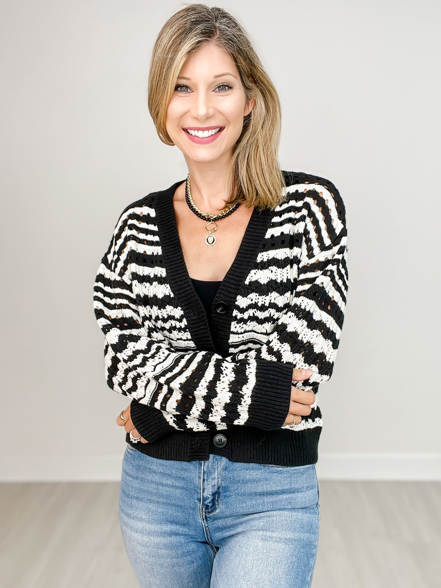 This lightweight knit cardigan is your new go-to for adding a touch of style to your layering. With long sleeves and a button-front design, it adds just the right touch of coziness without weighing you down. Perfect for breezy days or cool evenings, it’s easy to mix and match with your favorite outfits for a playful pop of comfort and style.