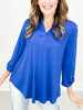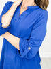 Lizzy 3/4" Length Sleeve Top with Mandarin Collar and Split Neckline in Royal Blue