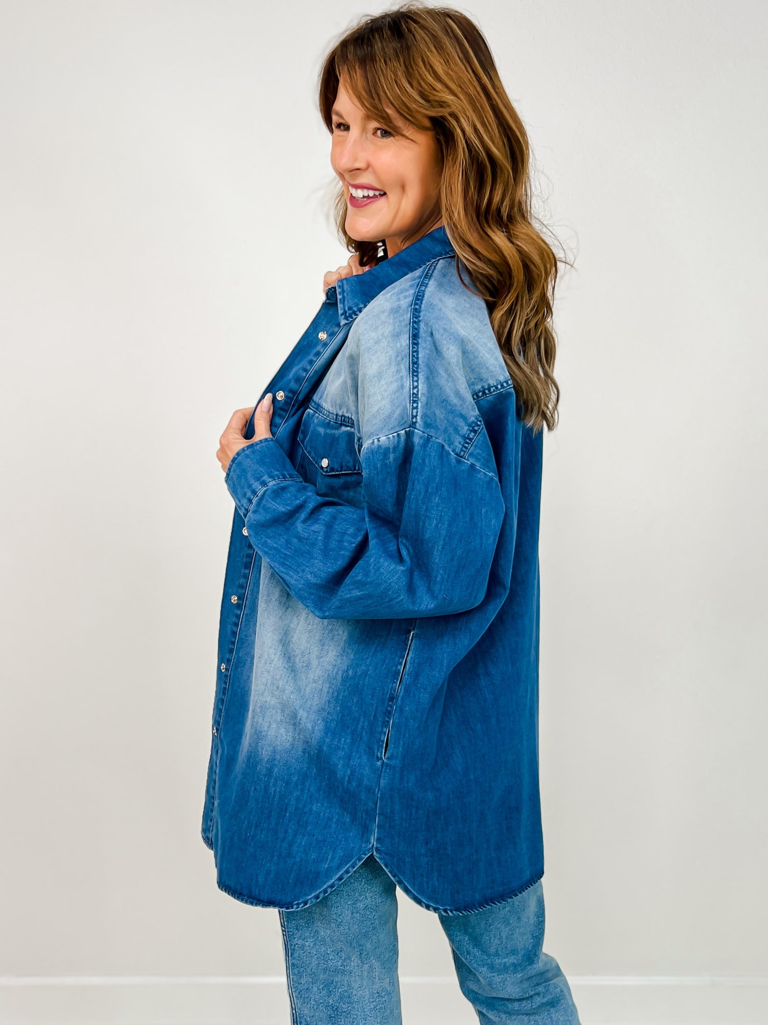 This Oversized Denim Button-Up Shirt Dress delivers a laid-back, effortlessly cool vibe. Featuring a faded wash for a vintage touch, chest flap pockets, and a relaxed fit, it’s perfect for wearing solo or layered over leggings. The curved hem and soft denim fabric make it a versatile staple for casual, all-season styling.