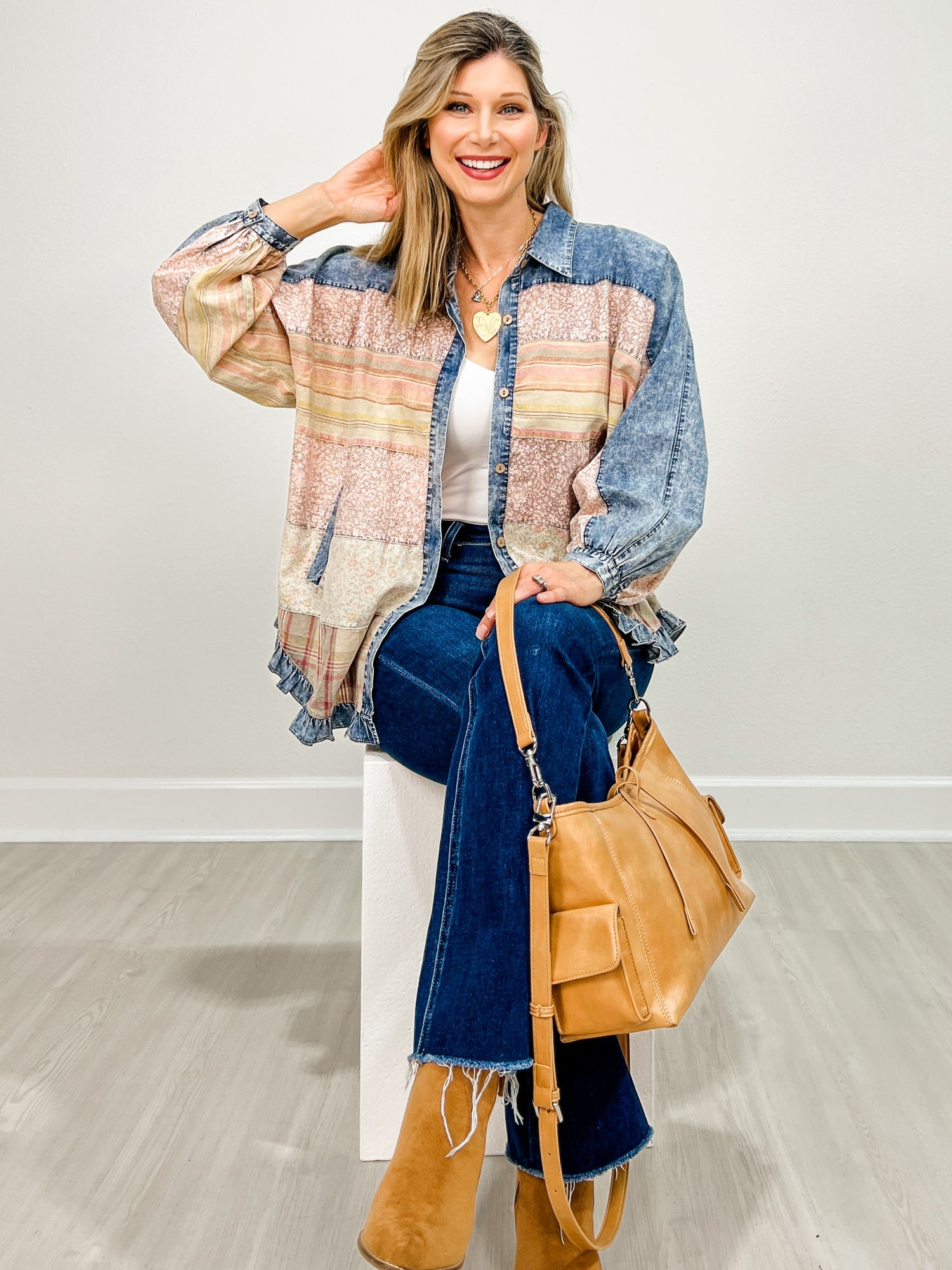Bloom into your next favorite layering piece with this charming long-sleeve button-up top. Featuring a vibrant floral print paired with contrasting accents, it's the perfect blend of botanical beauty and modern style. The classic button-front design makes it effortlessly versatile—wear it solo for a polished look or throw it over your favorite tee for added dimension. Whether you're dressing up for brunch or keeping it casual, this floral stunner brings a fresh pop of personality to any outfit.
