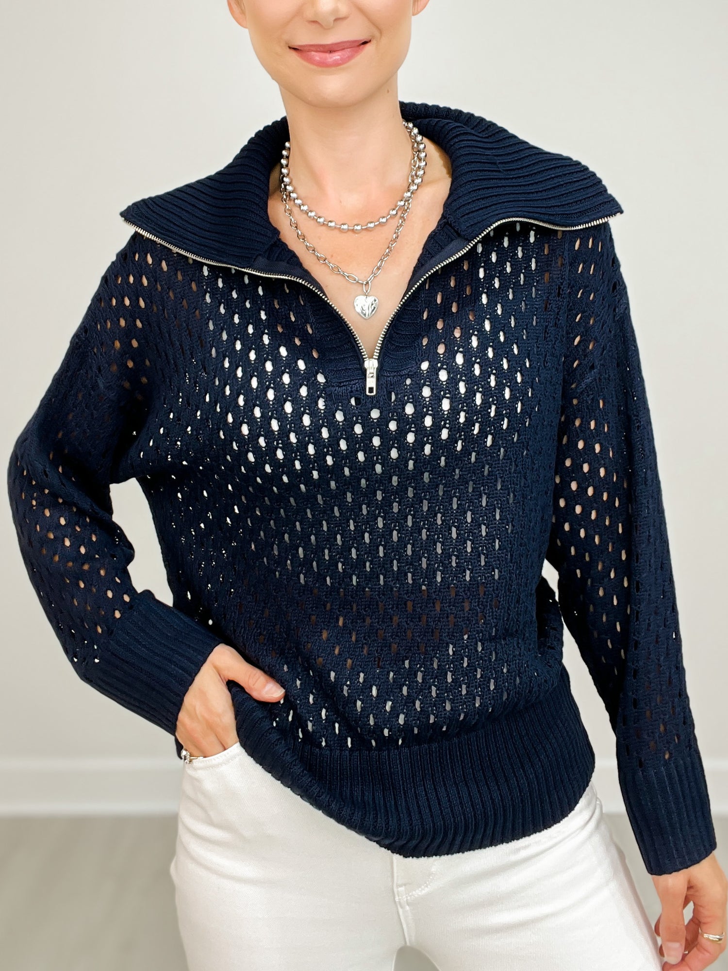Long Sleeve Solid Knit Sweater with Quarter Zip-Up Neckline