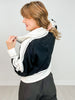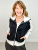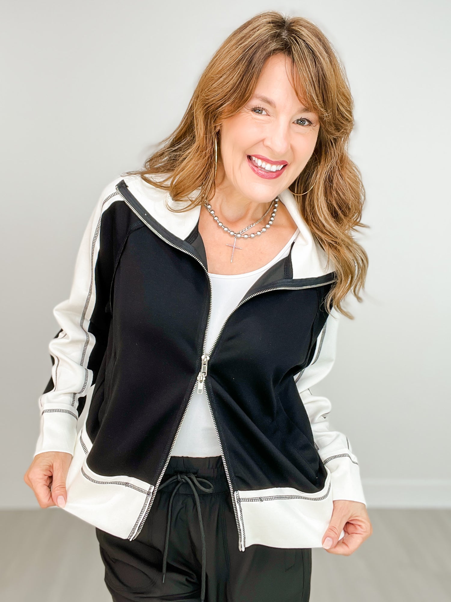 A long sleeve solid knit jacket with a zip up front featuring a color blocked body and a relaxed fit. Fabric is a lightweight knit.