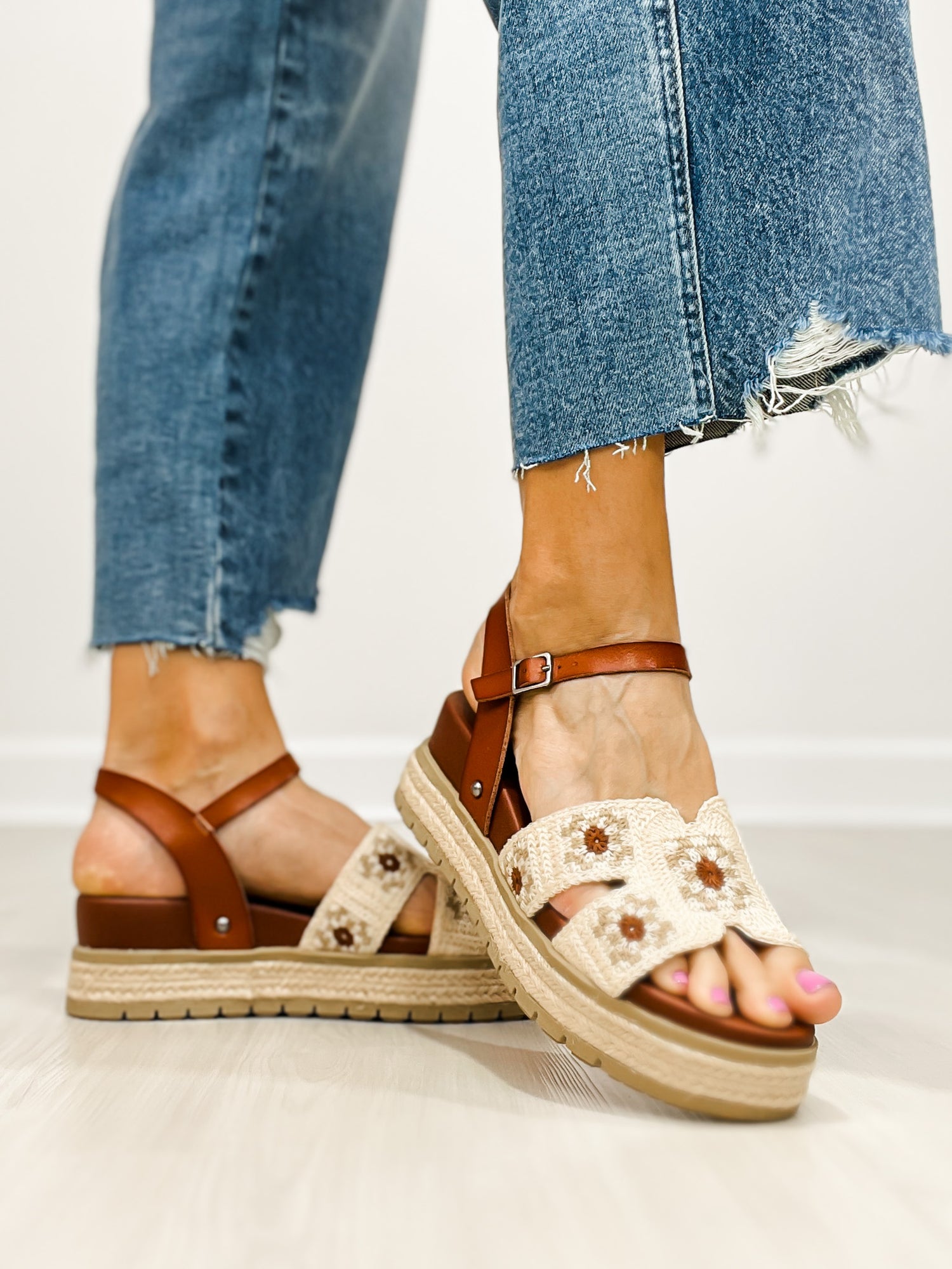Crochet straps and espadrille-inspired trim amplify the vintage vibes of this supportive and comfortable platform sandal.