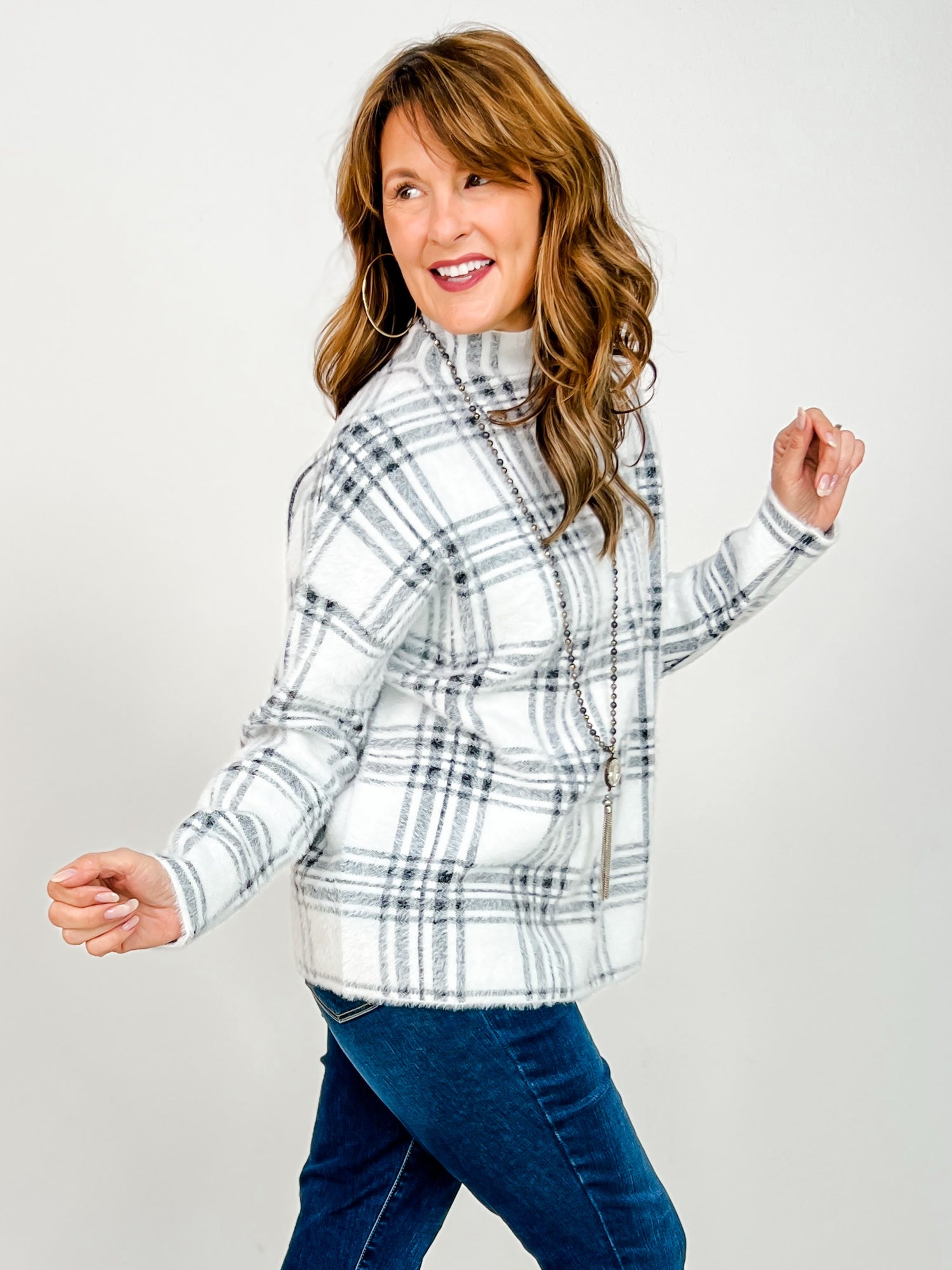 Cozy meets cool in this Mock Neck Plaid Knit Sweater! The playful plaid pattern adds a fun twist to your chilly-day wardrobe, while the soft knit and snug mock neck keep you warm and comfy. Perfect for layering or rocking solo, it’s your new favorite sweater for effortless style and laid-back vibes.