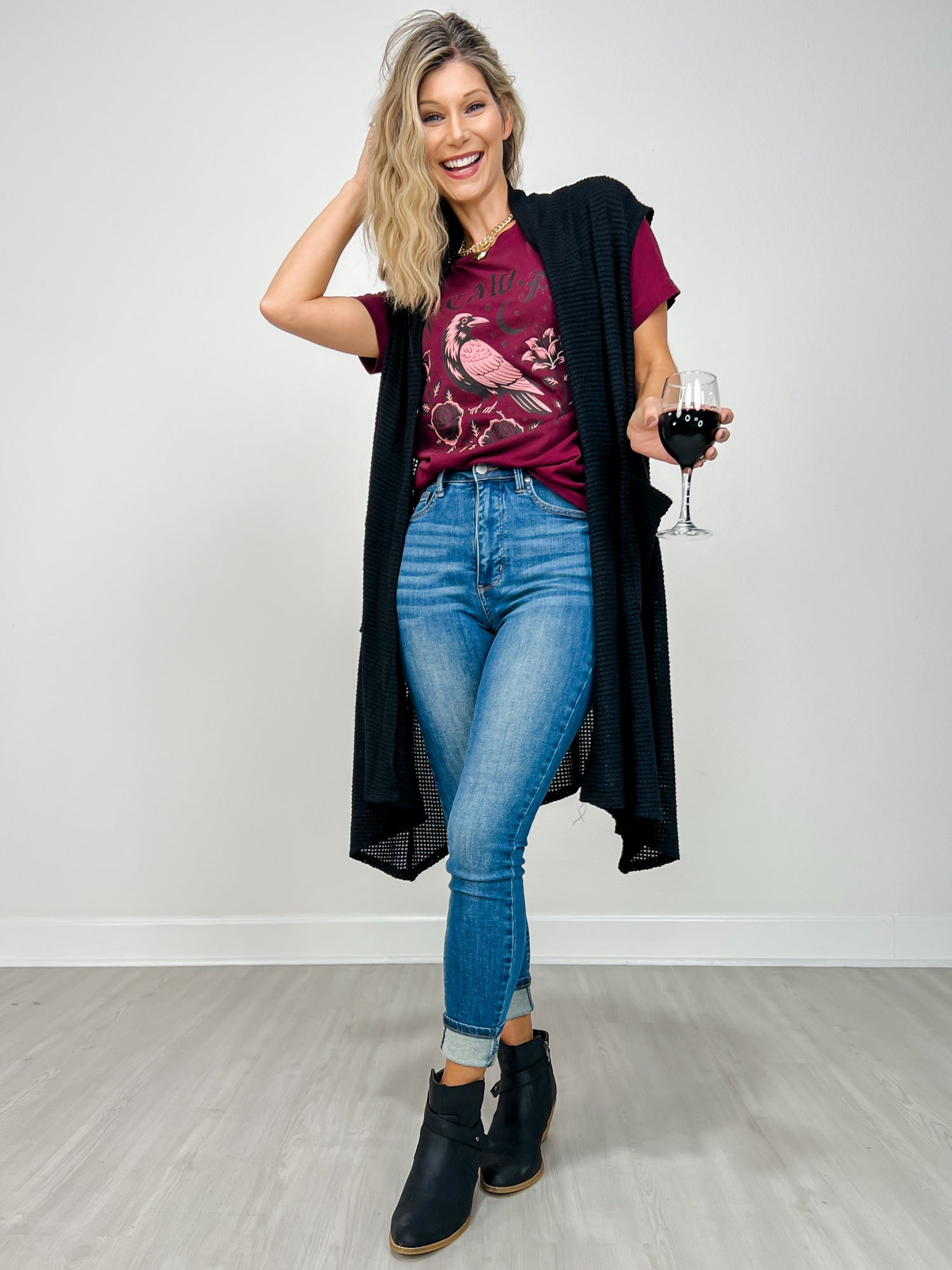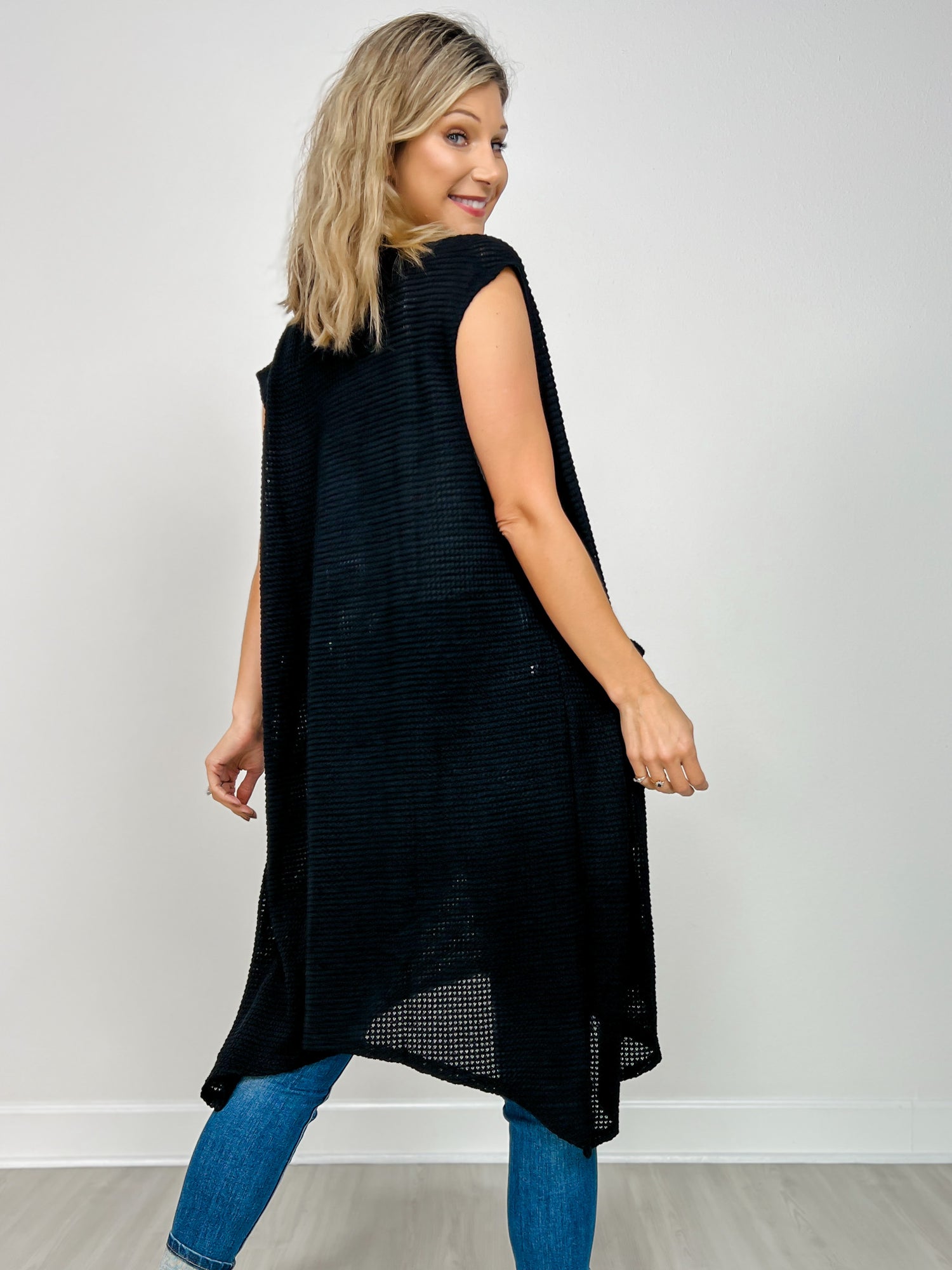 Open Front Crochet Midi Vest in BLACK