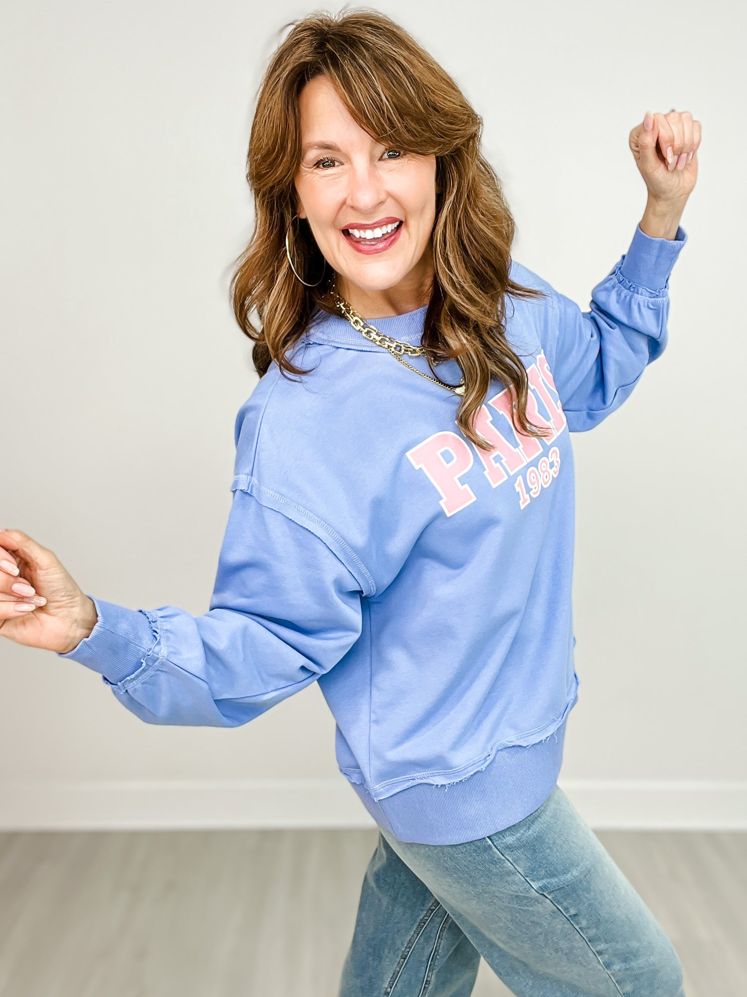 A long-sleeved solid knit pullover with a round neck featuring a "PARIS 1983" text detail and a relaxed fit. The fabric is a lightweight knit.