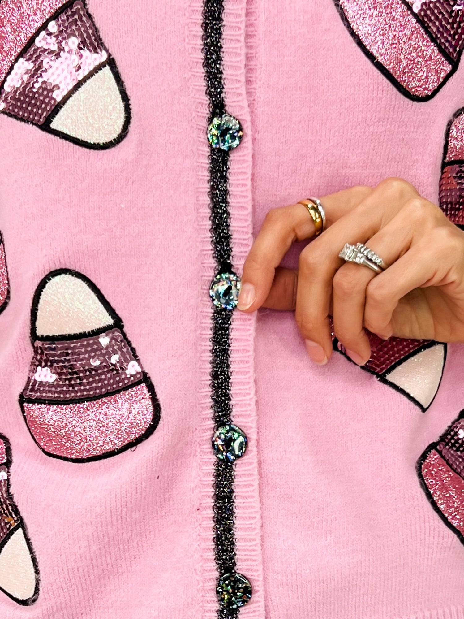 Add a splash of fun to your wardrobe with this Pink Sweater Vest featuring sparkling glitter candy corn details. Perfect for cozy days and festive vibes, it combines comfort with a playful twist that brightens any outfit. Embrace the sweet charm and shine wherever you go!