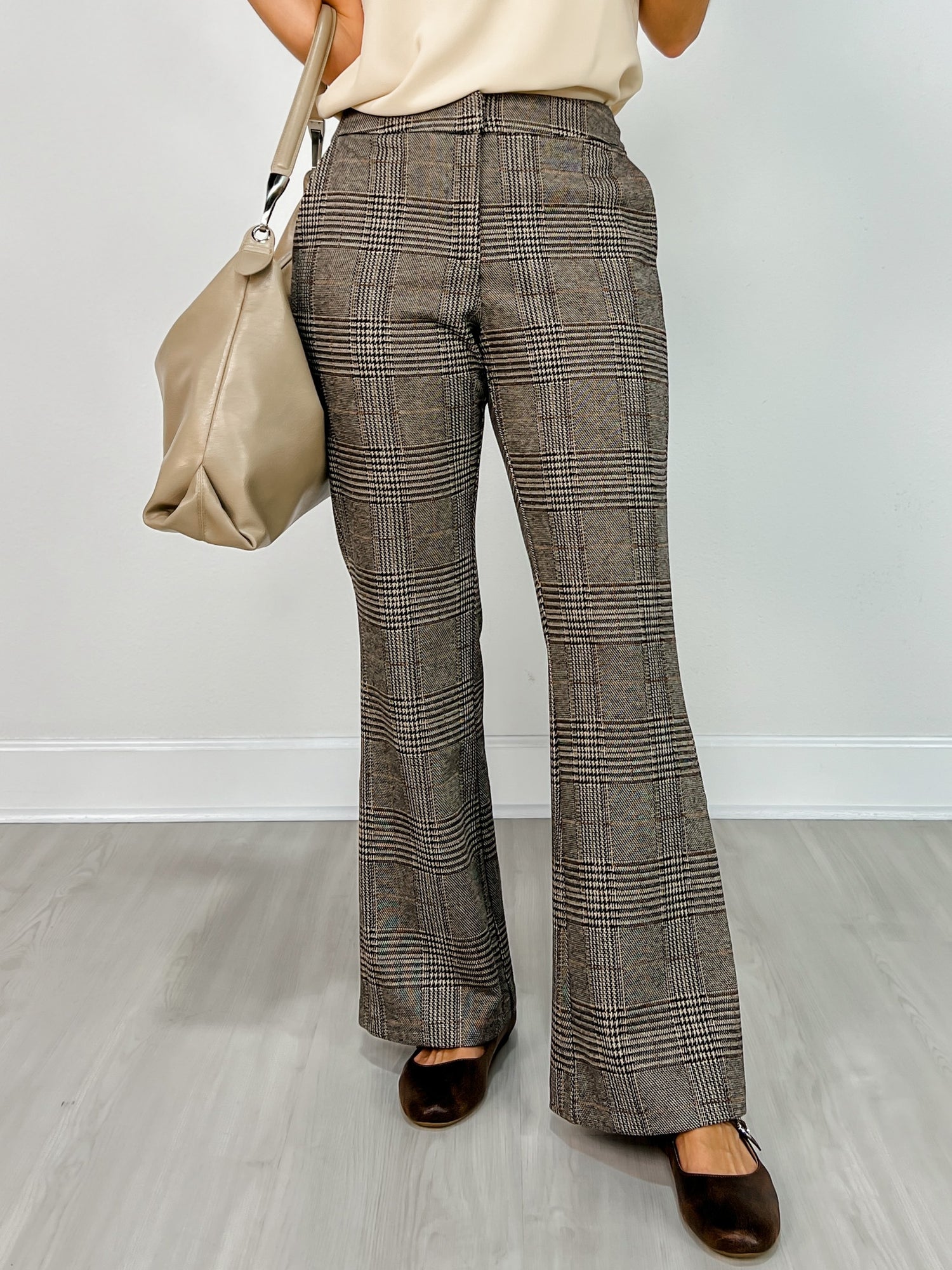 [message]Step into timeless sophistication with these tailored plaid trousers. Designed with a flattering high-rise fit and straight leg silhouette, they feature a classic check pattern in neutral tones for versatile styling. Perfect for work or weekend wear, these trousers strike a balance between polished structure and effortless comfort, pairing seamlessly with knits, blouses, or blazers.