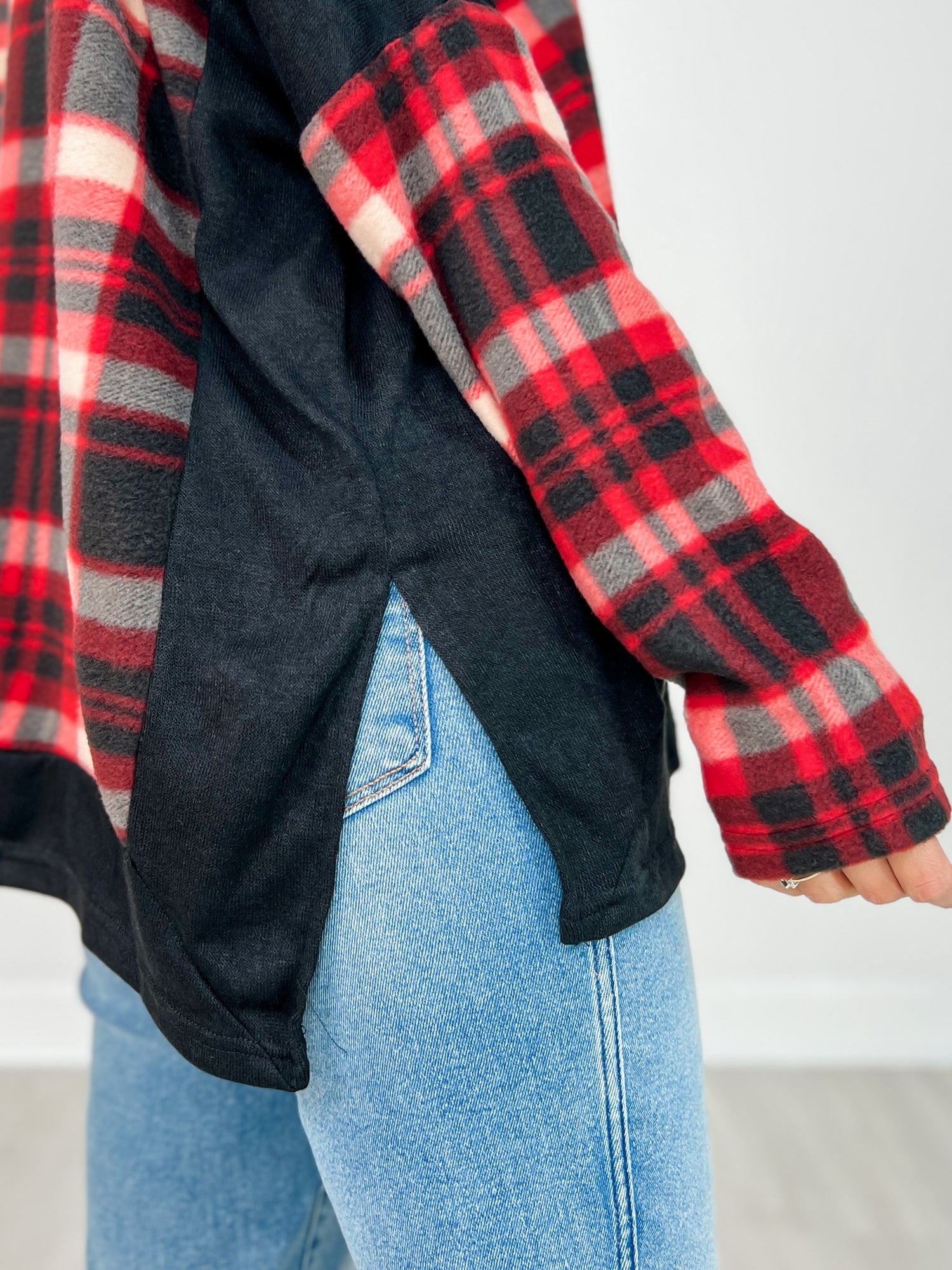 Plaid Knit Hooded Top with Kangaroo Pouch