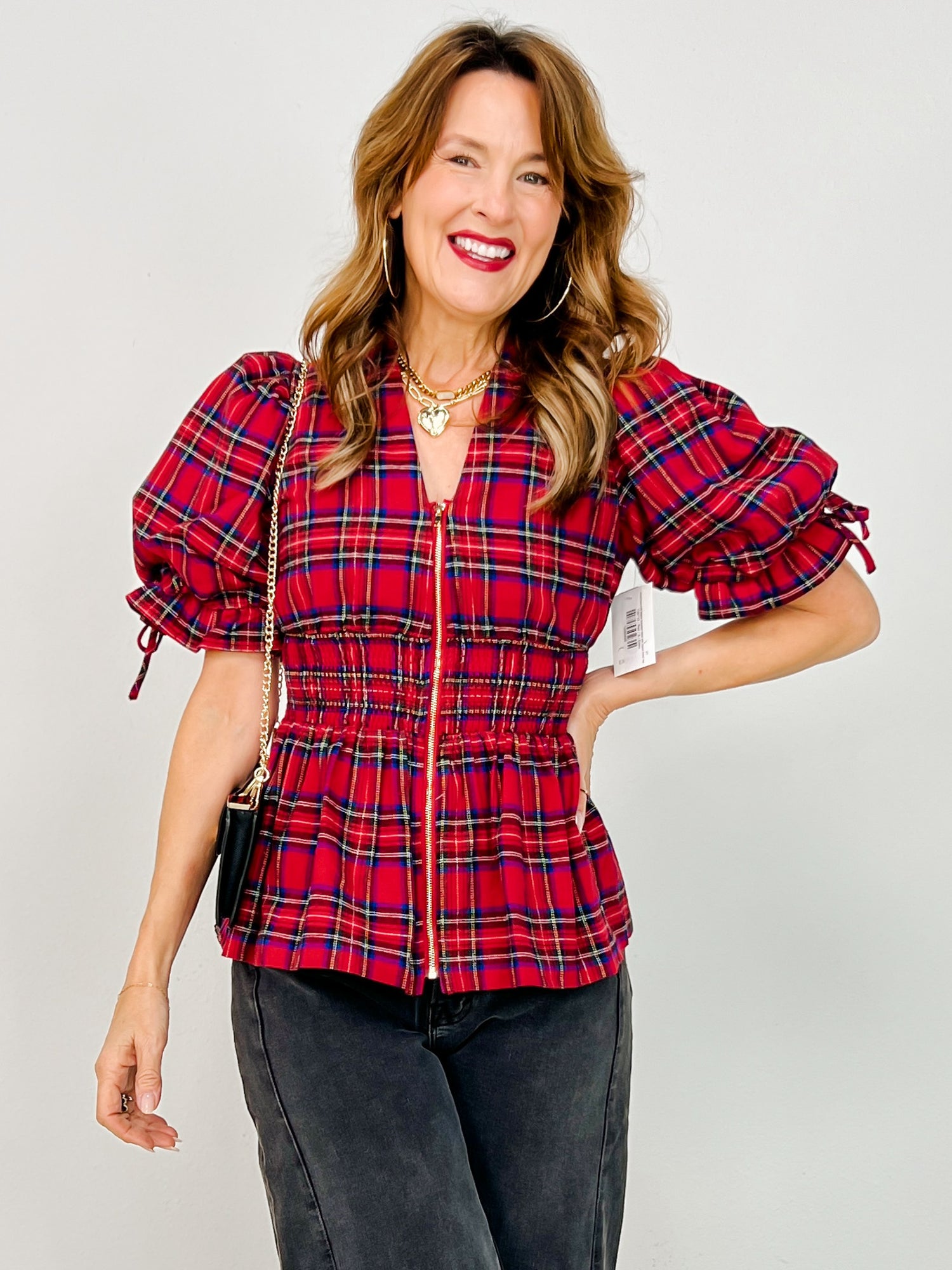 Plaid Short Puff Sleeve Smocked Waist with Zipper Front Top