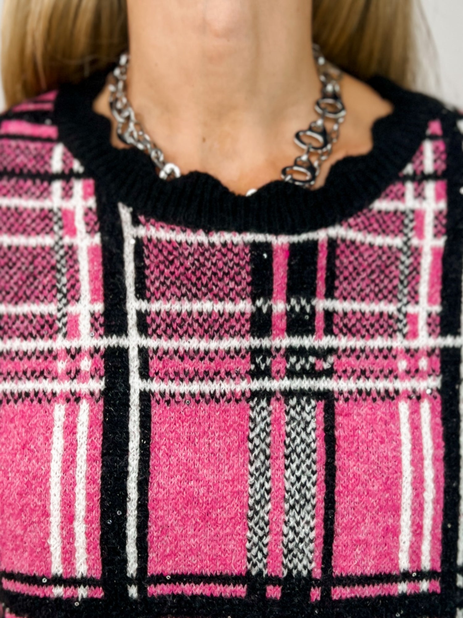 Add a touch of fun to your wardrobe with this Plaid Short Sleeve Knit Top featuring charming scallop edges. Its soft knit fabric keeps you comfy all day, while the playful plaid pattern and delicate scalloped trim bring a flirty, fresh vibe to any outfit. Perfect for casual days when you want to feel cozy and cute!