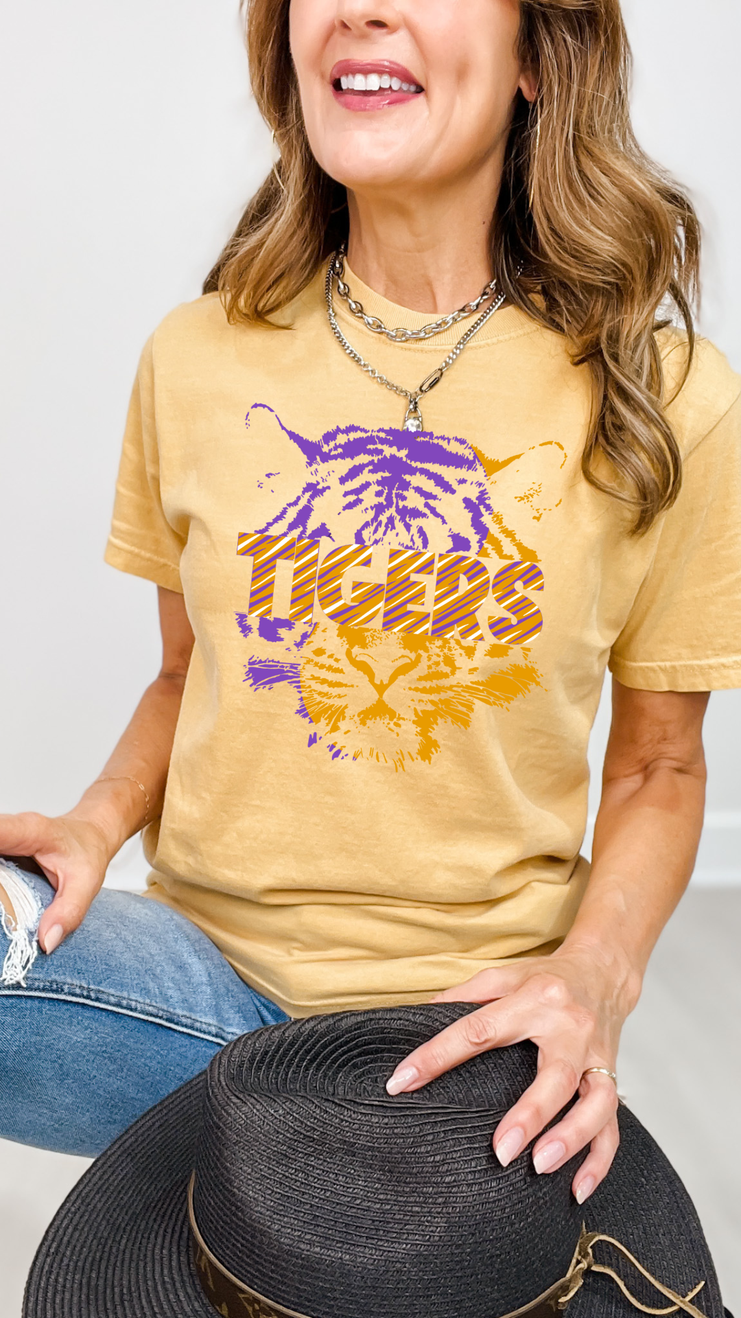 This mustard tee roars with personality! Featuring a fierce tiger face in purple and gold, layered with retro-striped “TIGERS” text, it’s bold, vibrant, and ready to rally. The ultimate wear-anywhere style for LSU fans with edge. Same fierce design, also offered in a fresh neutral. This cream-colored option features that eye-catching tiger face and striped “TIGERS” lettering that pops off the fabric. Versatile enough to wear with denim, skirts, or stadium vibes.