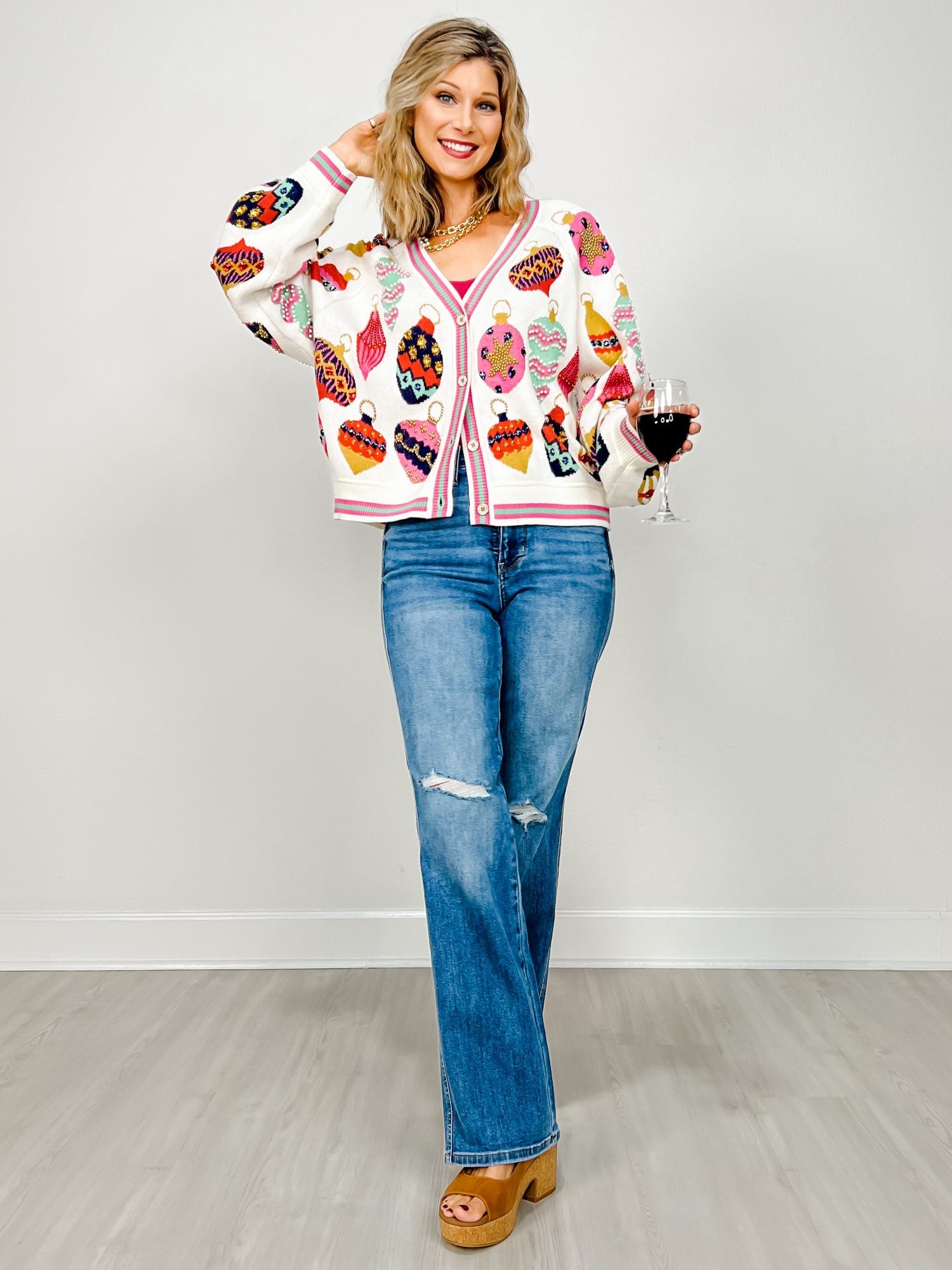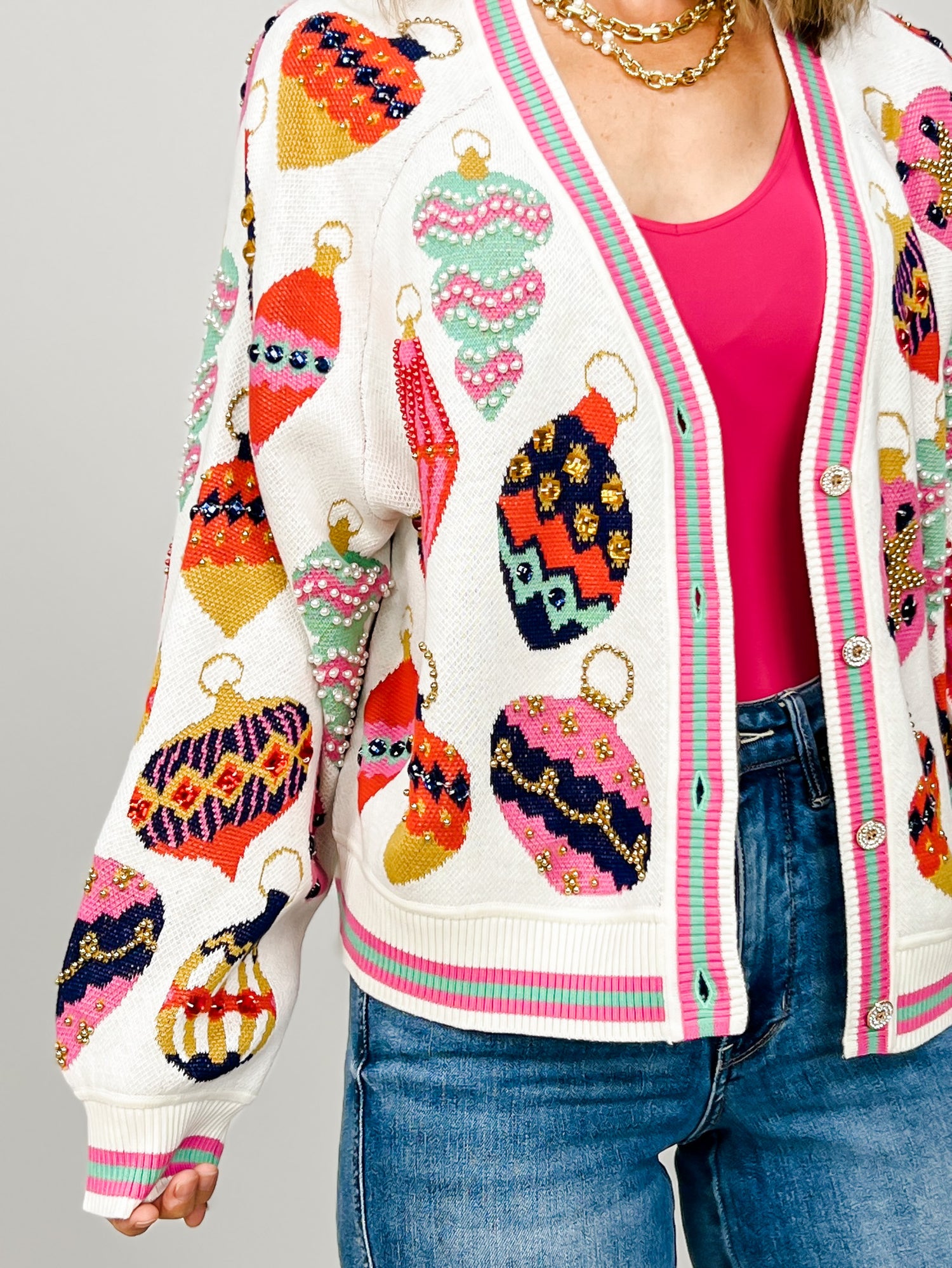 Get ready to deck the halls in style! This festive Queen of Sparkles cardigan is covered in colorful sequin ornaments that shimmer with every move. The playful pattern pops against a soft white knit trimmed in candy-pink — it’s cozy, cheerful, and full of holiday sparkle. Perfect for parties, gift wrapping marathons, or just spreading cheer everywhere you go!